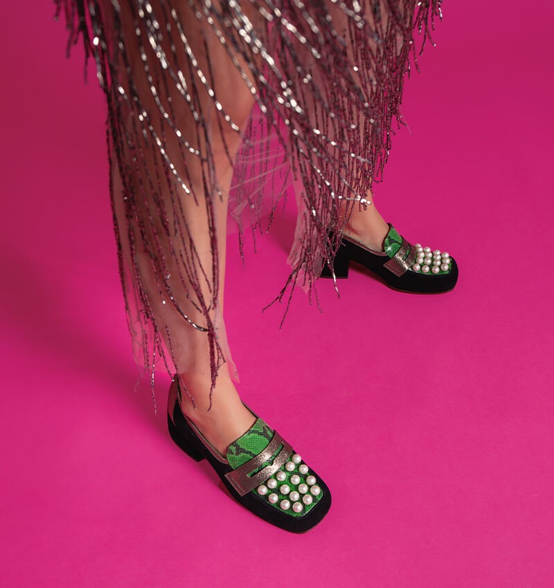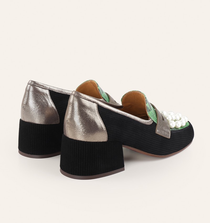 Metaliczne wykończenie na szorstkim zamszu. Podeszwa skórzana z antypoślizgową gumową częścią na spodzie