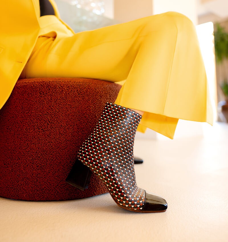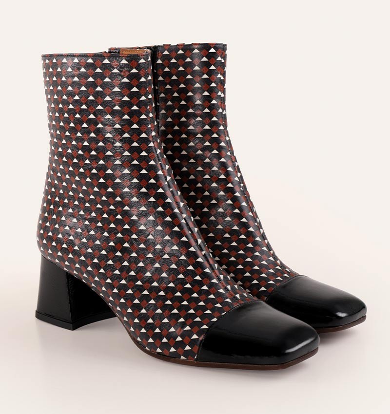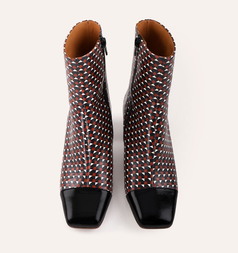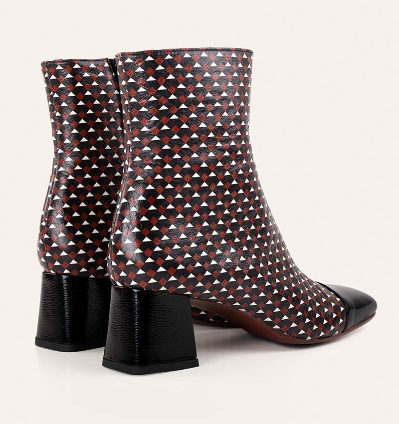 Geometryczny nadruk na skórze. Zapięcie na zamek błyskawiczny. Podeszwa skórzana z antypoślizgową gumową częścią na spodzie.