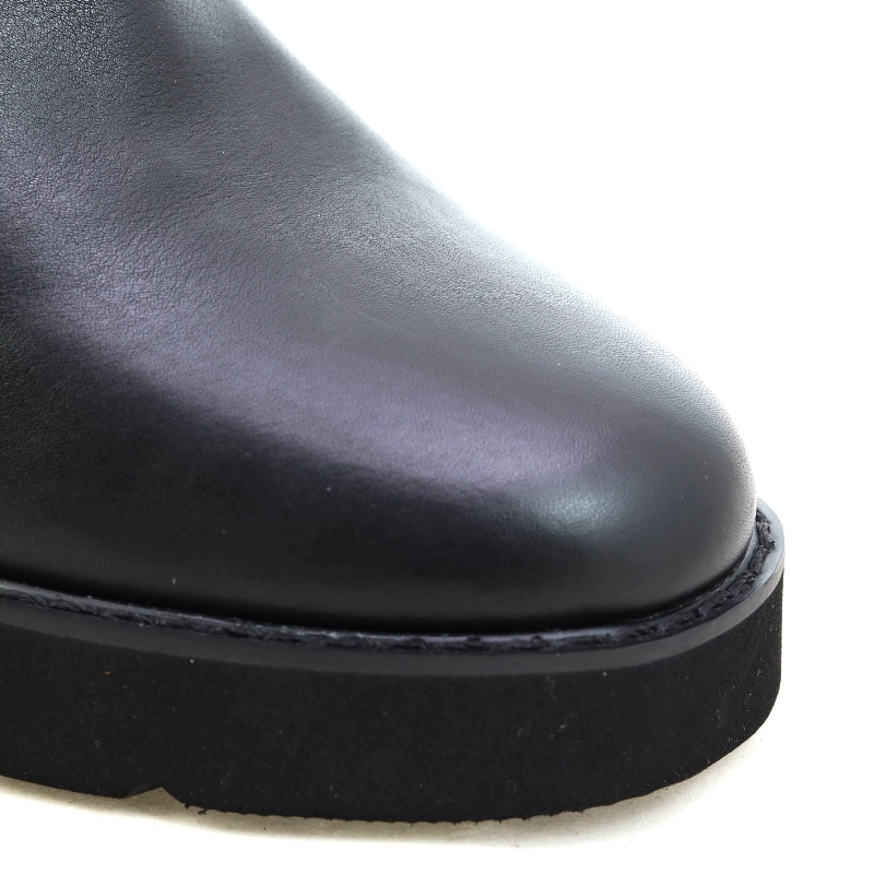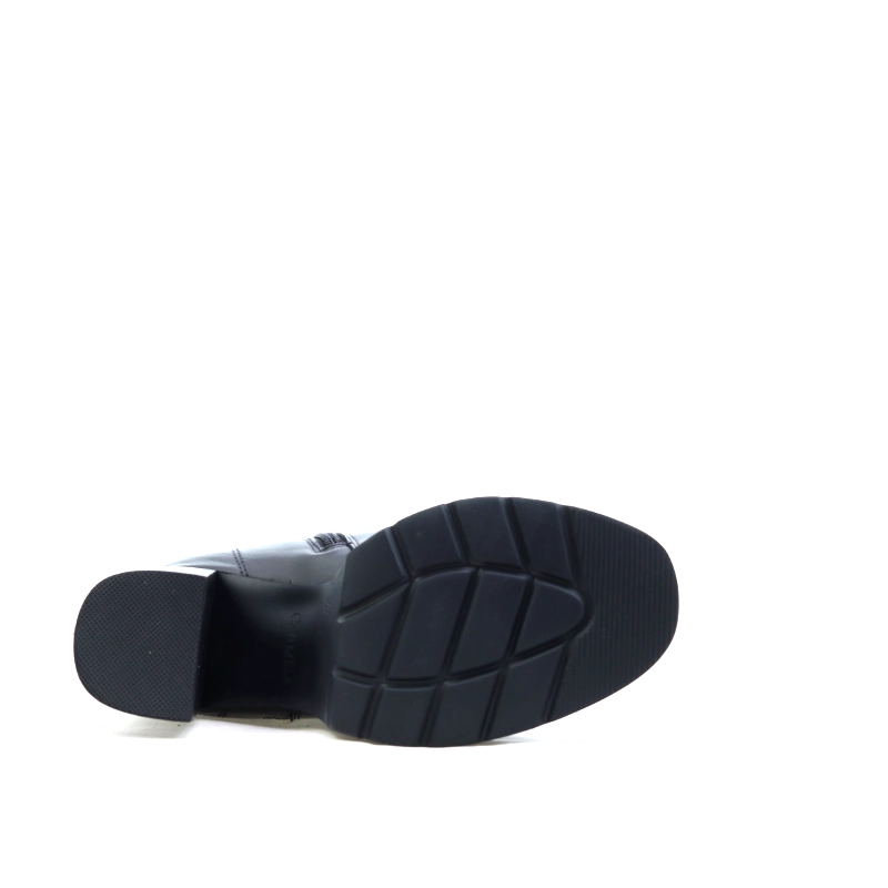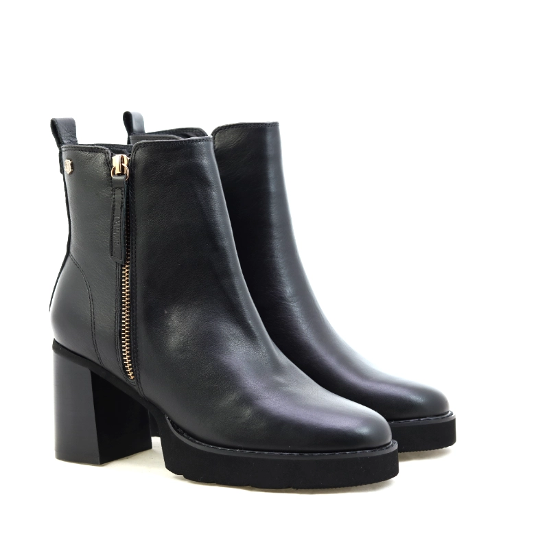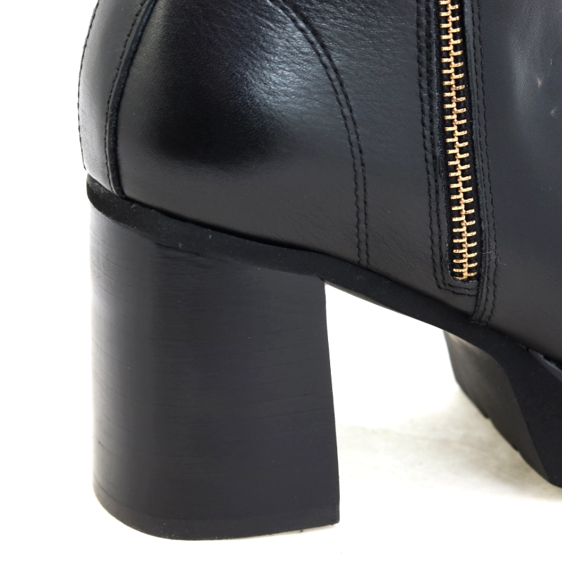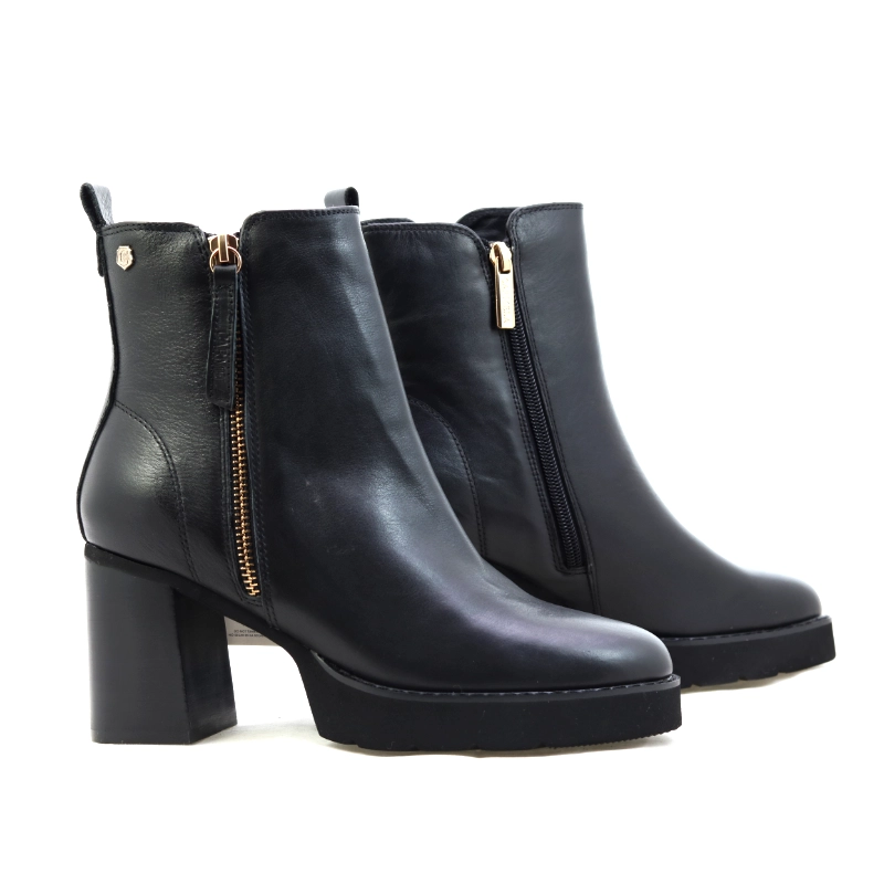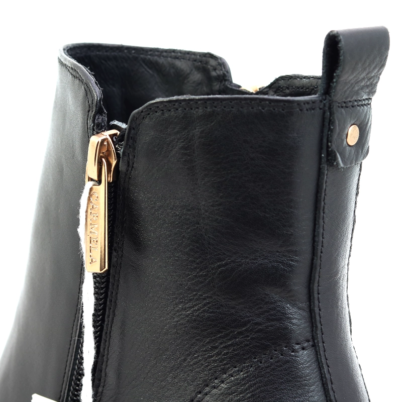 Model Carmela 162602 to eleganckie czarne botki damskie wykonane z naturalnej skóry wysokiej jakości. Klasyczna cholewka o gładkim wykończeniu została uzupełniona złotymi suwakami – jednym funkcjonalnym i drugim ozdobnym – które dodają całości nowoczesnego, kobiecego charakteru. Stabilny, szeroki obcas i delikatna platforma zapewniają komfort podczas chodzenia, jednocześnie subtelnie wydłużając sylwetkę. To model idealny do codziennych i eleganckich stylizacji – świetnie wygląda zarówno z jeansami, jak i z ołówkową spódnicą czy płaszczem.