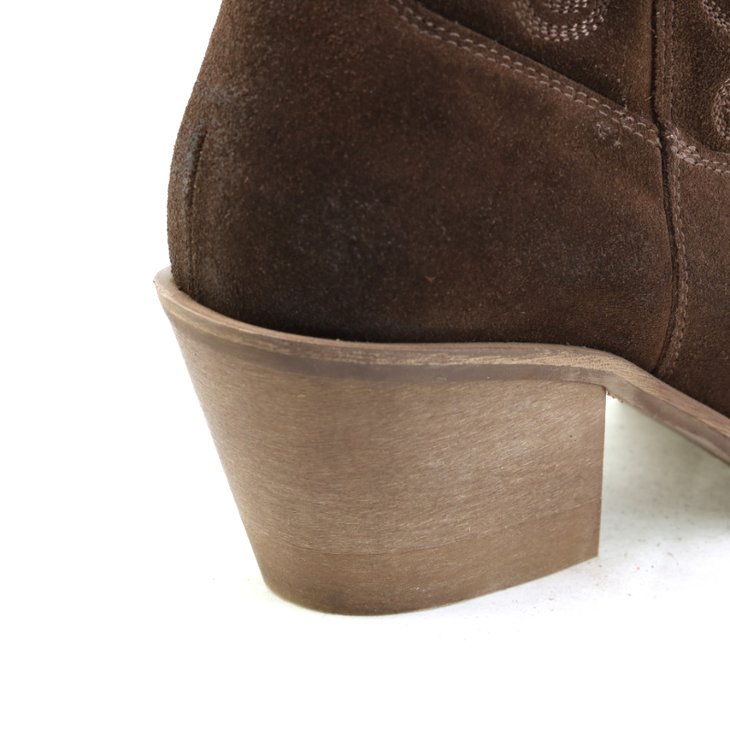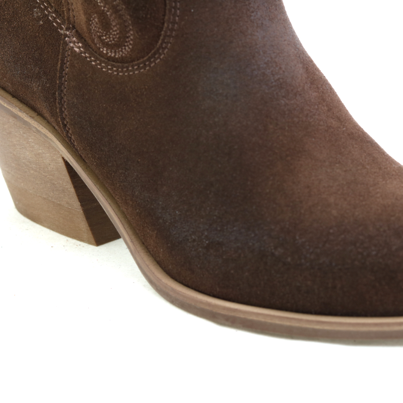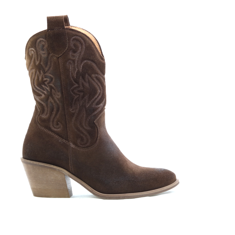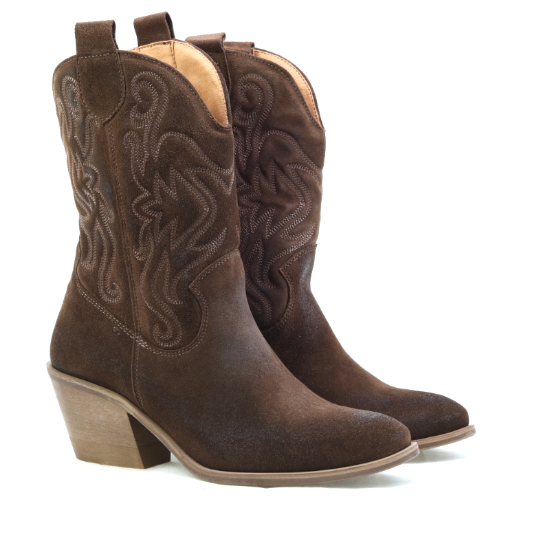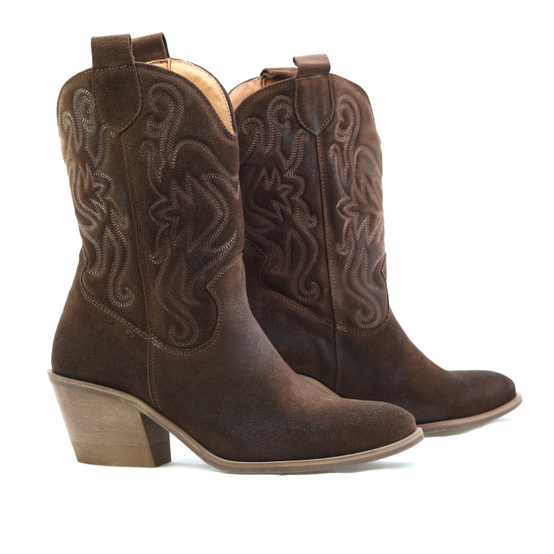 Botki w stylu kowbojskim w głębokim, brązowym odcieniu to połączenie klasyki z modowym charakterem. Zamszowa cholewka ozdobiona efektownymi, haftowanymi wzorami nadaje im autentycznego, westernowego klimatu, a zaokrąglony nosek i stabilny, lekko ścięty obcas zapewniają wygodę na co dzień. Praktyczna szlufka ułatwia zakładanie, a ponadczasowy fason sprawia, że model świetnie uzupełni zarówno casualowe stylizacje, jak i bardziej wyraziste, inspirowane stylem boho czy country.