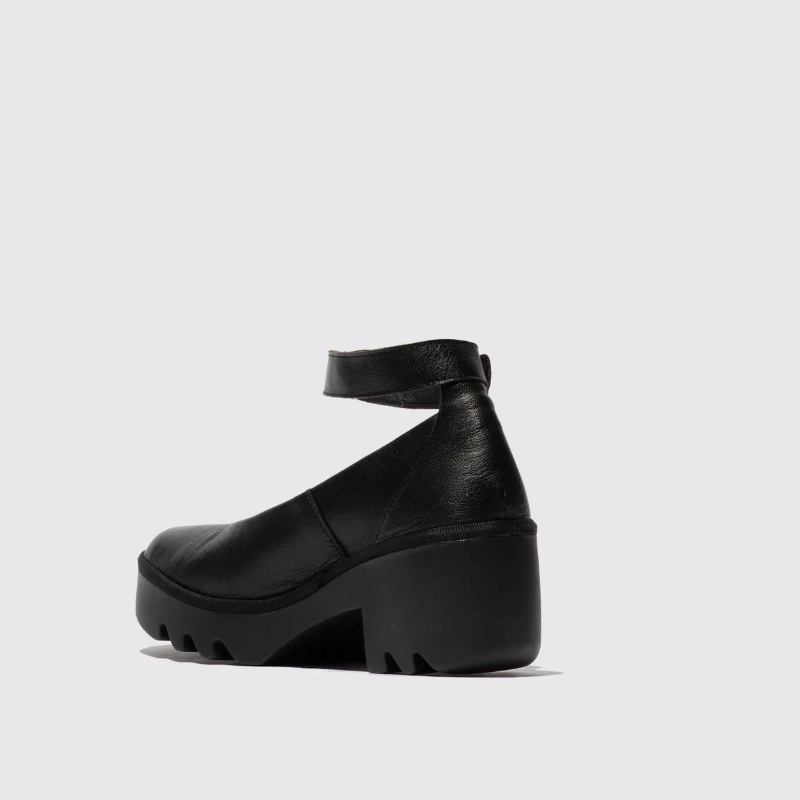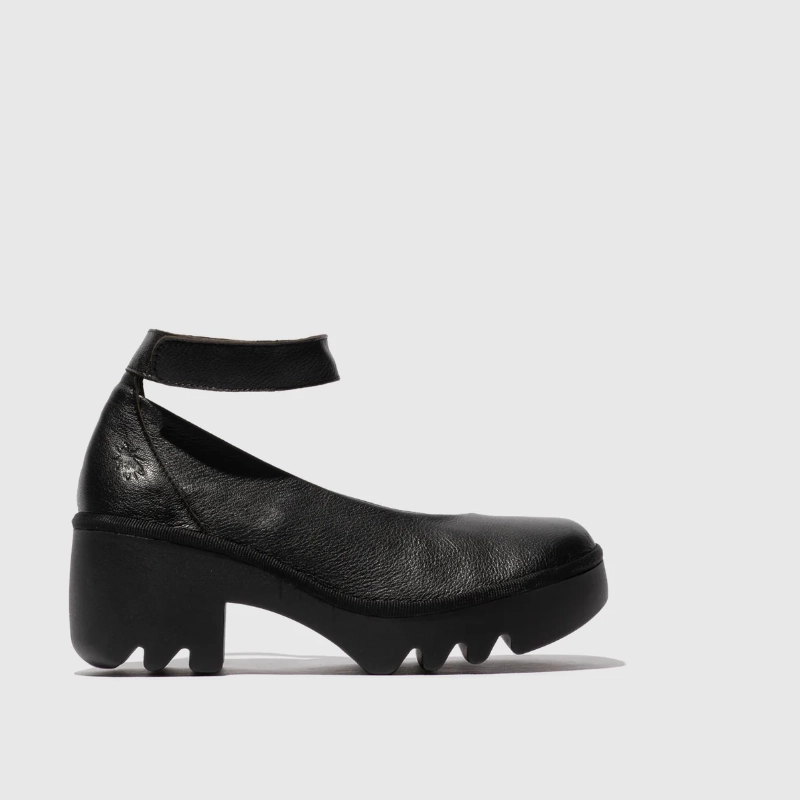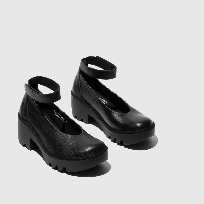 Fly London TIRY497FLY Black to nietuzinkowe czółenka na platformie, które łączą kobiecy styl z odważnym, nowoczesnym charakterem. Wykonane z miękkiej, naturalnej skóry w klasycznej czerni, mają zaokrąglony nosek i masywną podeszwę z wyraźnym bieżnikiem, która dodaje im miejskiego pazura. Stabilny, szeroki obcas zapewnia wygodę na co dzień, a pasek wokół kostki zapinany na rzep gwarantuje pewne dopasowanie i podkreśla linię nóg. Dzięki solidnej konstrukcji i komfortowej wyściółce model świetnie sprawdzi się zarówno w casualowych, jak i bardziej awangardowych stylizacjach, oferując charakterystyczny dla Fly London balans między funkcjonalnością a oryginalnym designem.