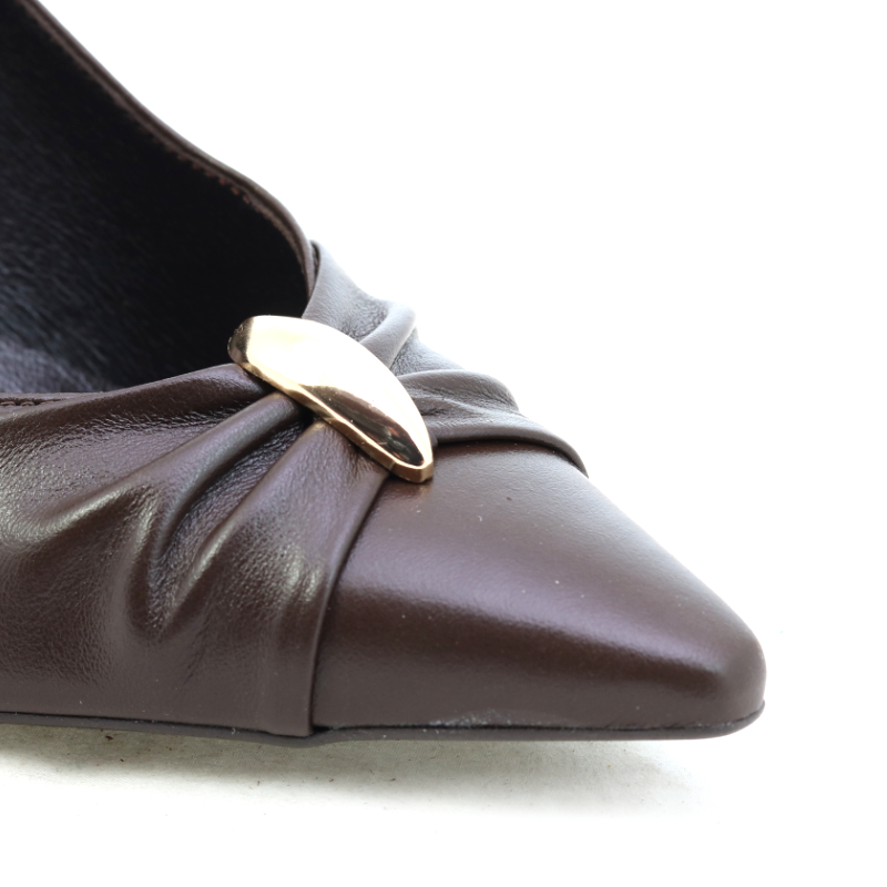 Eleganckie szpilki w głębokim, czekoladowym odcieniu to kwintesencja kobiecej klasy i ponadczasowego stylu. Smukły, spiczasty nosek wysmukla stopę, a subtelne marszczenie z delikatną ozdobą dodaje całości finezji. Stabilny, lekko rozszerzany obcas zapewnia wygodę i pewność kroku, dzięki czemu model doskonale sprawdzi się zarówno w eleganckich stylizacjach, jak i jako stylowe uzupełnienie codziennego outfitu.