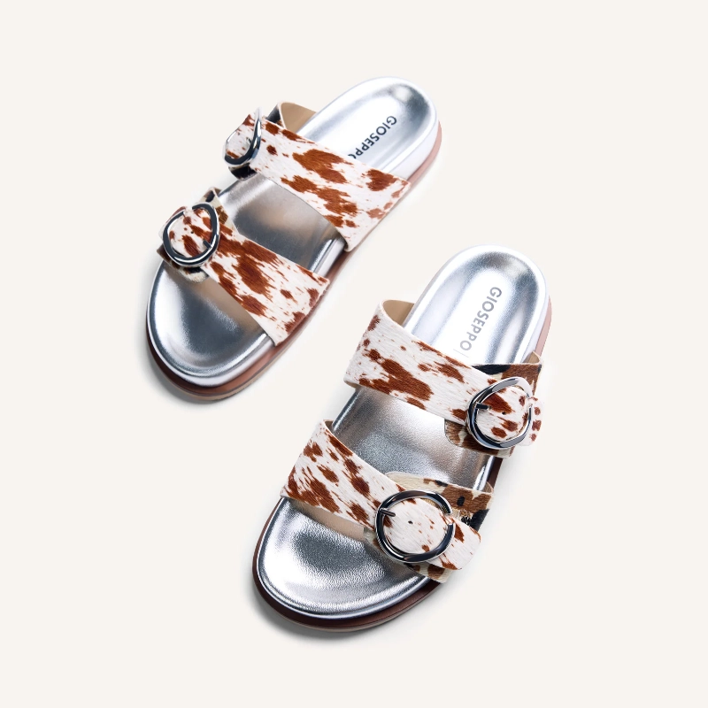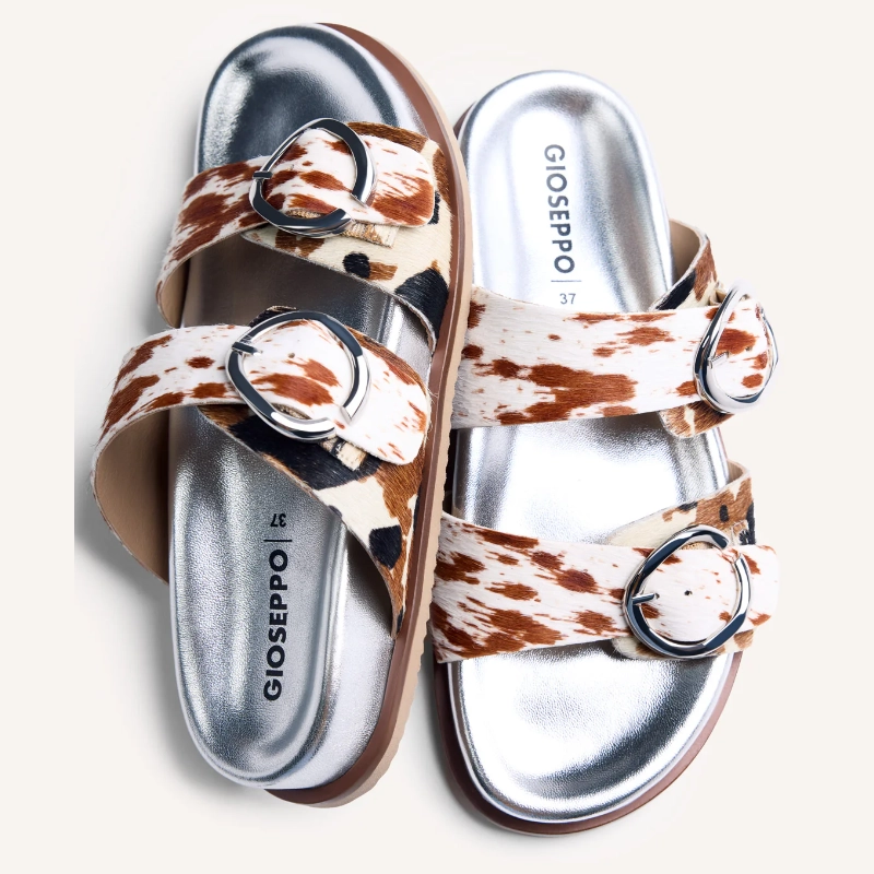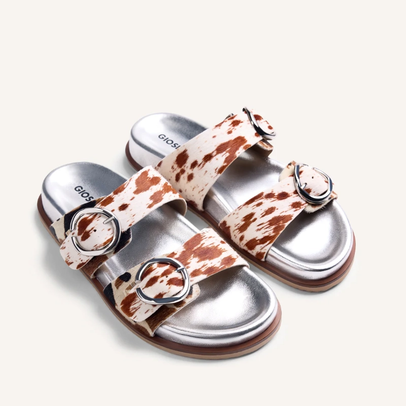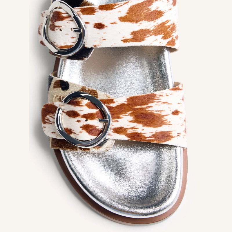 Skórzane sandały z nadrukiem zwierzęcym i klamrami. Posiadają podeszwę z bioteksturą, wyściełaną metaliczną skórą, ergonomicznie zaprojektowaną, aby równomiernie rozłożyć ciężar. Cholewka, podszewka i wkładka wykonane są ze skóry. Lekka podeszwa z pianki EVA.