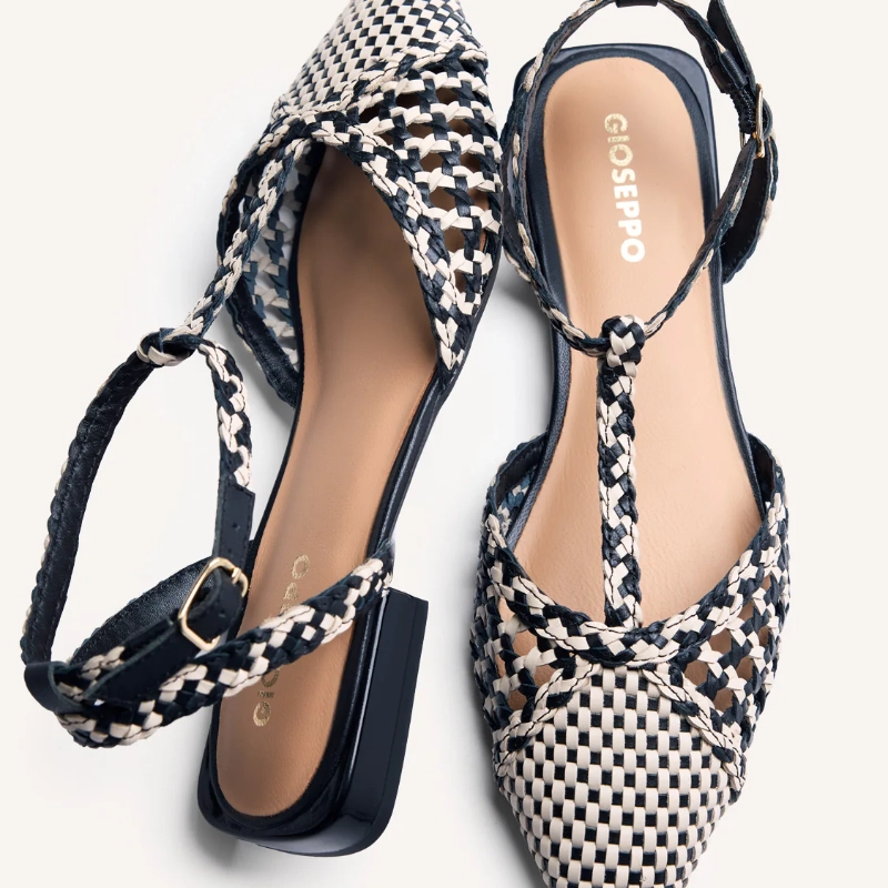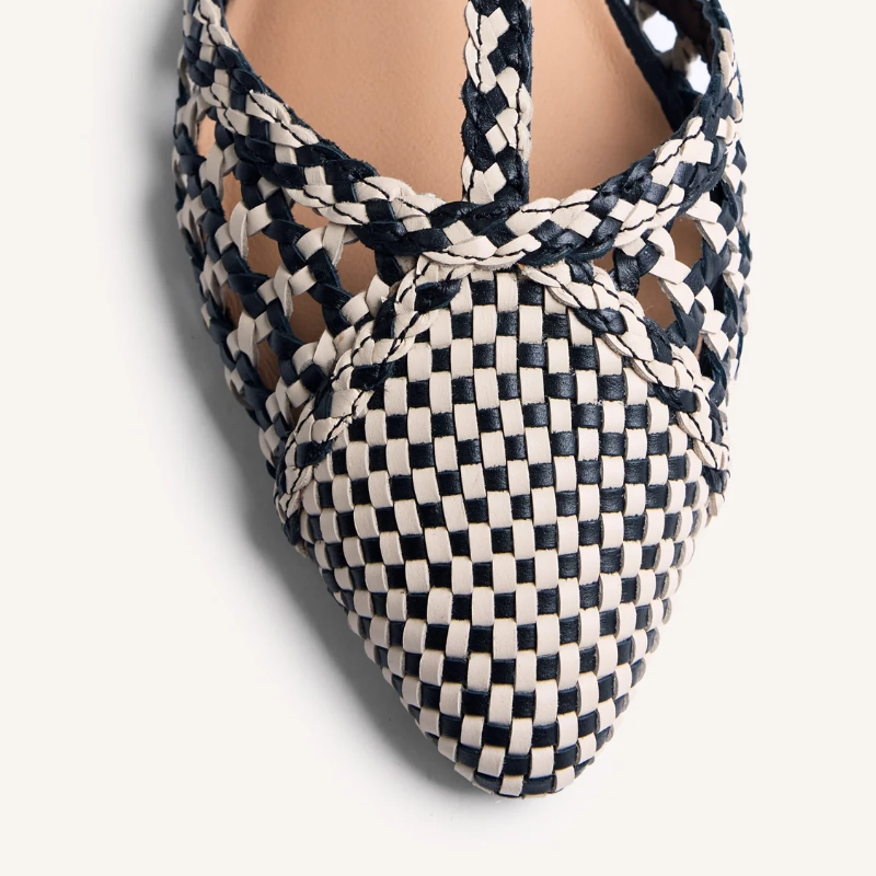 Dwukolorowe, skórzane balerinki z ręcznie tkanym splotem. Nosek w szpic. Posiadają regulowane zapięcia przy kostce i pasek na podbiciu. Wysokość obcasa: 1,5 cm. Możliwe różnice w kolorze skóry lub wykończeniu między butami odzwierciedlają autentyczność rzemieślniczego procesu i wykorzystania skór naturalnych. Cholewka, podszewka i wkładka wykonane ze skóry. Elastyczna podeszwa z tworzywa TPR.