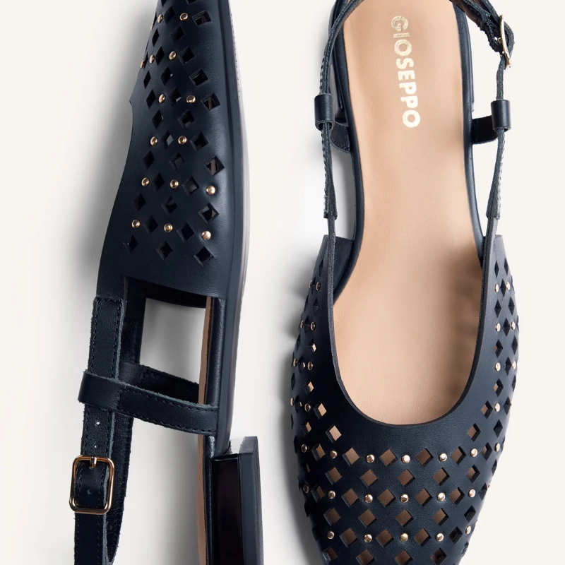 Skórzane balerinki z wycięciami i ćwiekami. Kwadratowy nosek. Metalowy obcas. Posiadają wyściełaną wkładkę i regulowane paski przy kostce. Model ten wyróżnia się elastycznością i lekkością, ponieważ nie posiada ograniczników palców ani zapiętka. Cholewka, podszewka i wkładka wykonane są ze skóry. Elastyczna podeszwa z tworzywa TPR.