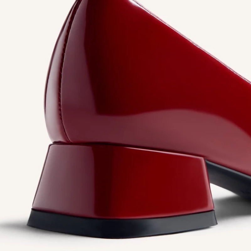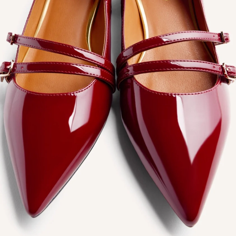 Buty w stylu Mary-Jane z wykończeniem z lakierowanej skóry. Nosek w szpic. Posiadają wyściełaną wkładkę, niski, klockowy obcas i regulowane zapięcia na podbiciu. Wysokość obcasa: 3 cm. Cholewka, podszewka i wkładka wykonane z poliuretanu. Elastyczna, gumowa podeszwa.