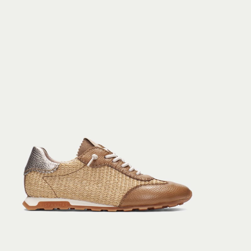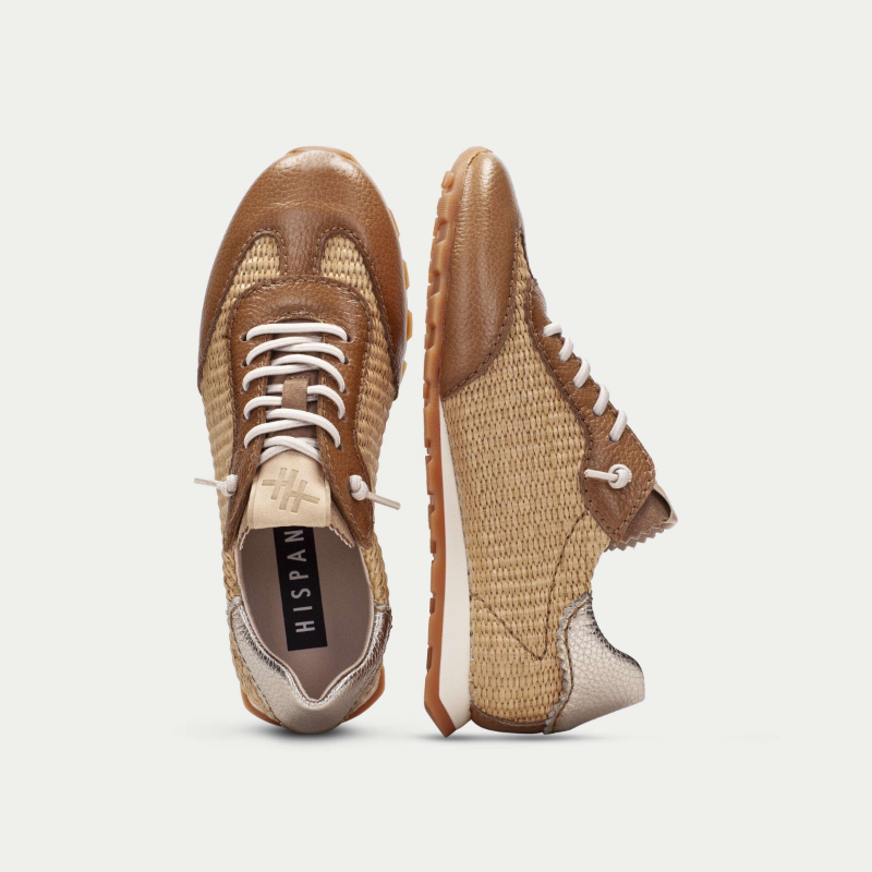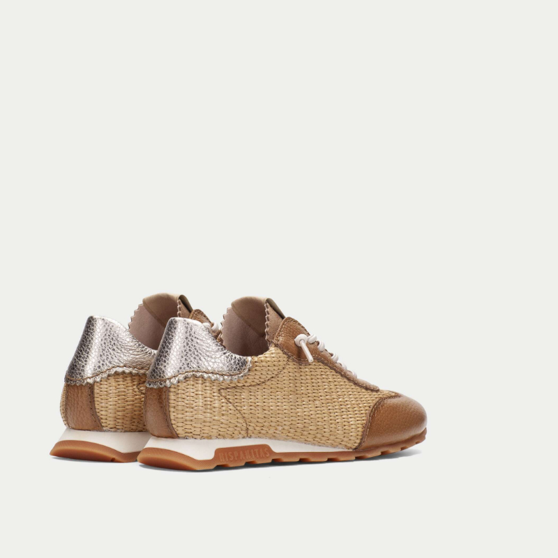 Sneaker w naturalnym, letnim wydaniu łączy plecioną strukturę z eleganckimi, skórzanymi wstawkami w ciepłym, złocisto-beżowym odcieniu. Lekka, przewiewna cholewka nadaje mu świeżości i sprawia, że idealnie sprawdzi się w cieplejsze dni, a subtelnie połyskujące detale dodają całości stylowego charakteru. Klasyczne sznurowanie i wygodna, amortyzująca podeszwa zapewniają komfort noszenia na co dzień, czyniąc ten model świetnym wyborem do casualowych, wakacyjnych stylizacji.