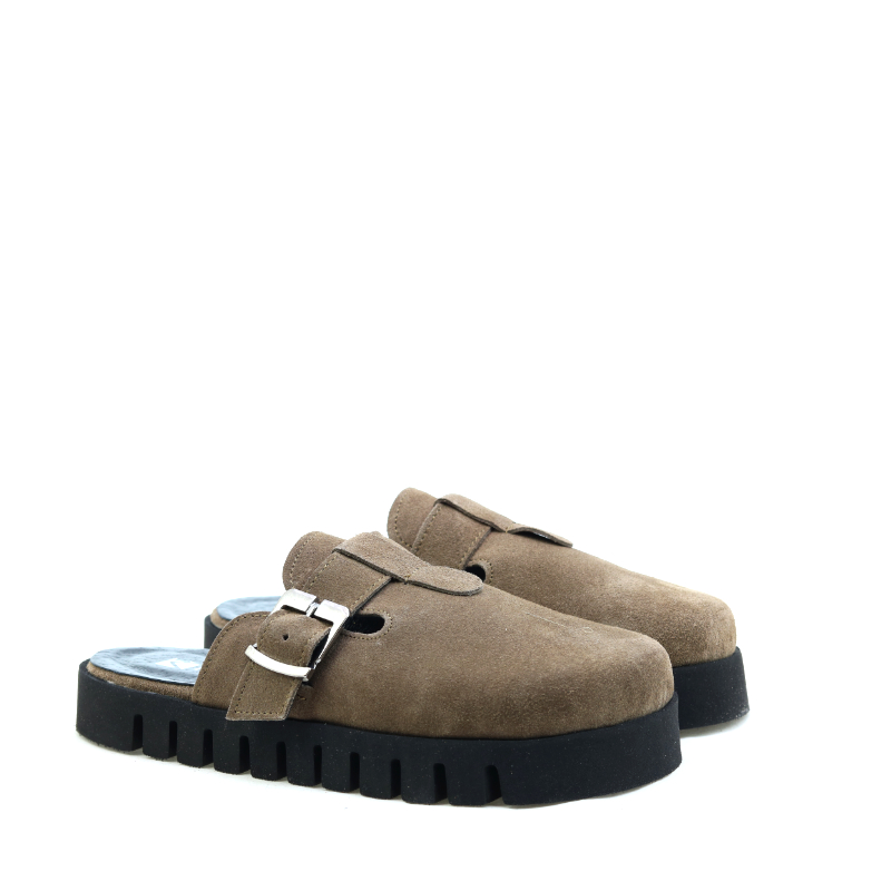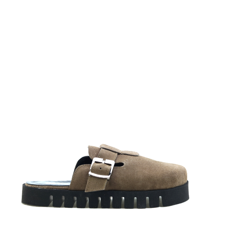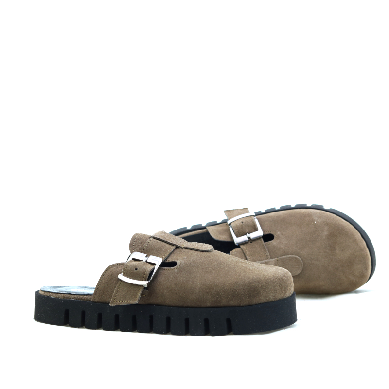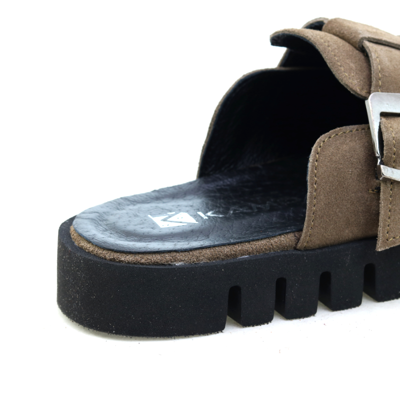 Klapki w odcieniu ciepłego beżu łączą minimalistyczną formę z mocnym, nowoczesnym charakterem dzięki grubej, czarnej podeszwie o wyrazistym bieżniku. Zabudowany przód delikatnie otula stopę, a szeroki pasek z metalową klamrą pozwala na regulację i dodaje całości industrialnego akcentu. Miękka wkładka zwiększa komfort noszenia, sprawiając, że model świetnie sprawdzi się zarówno w codziennych stylizacjach, jak i jako modny kontrapunkt do bardziej eleganckich zestawów.