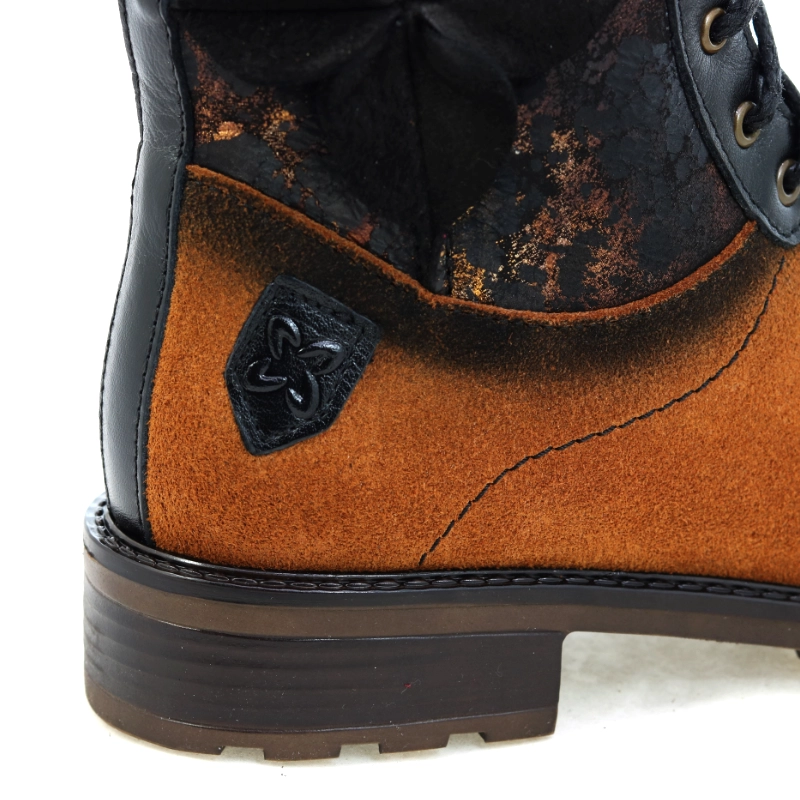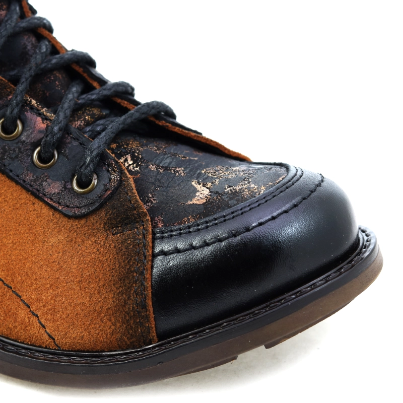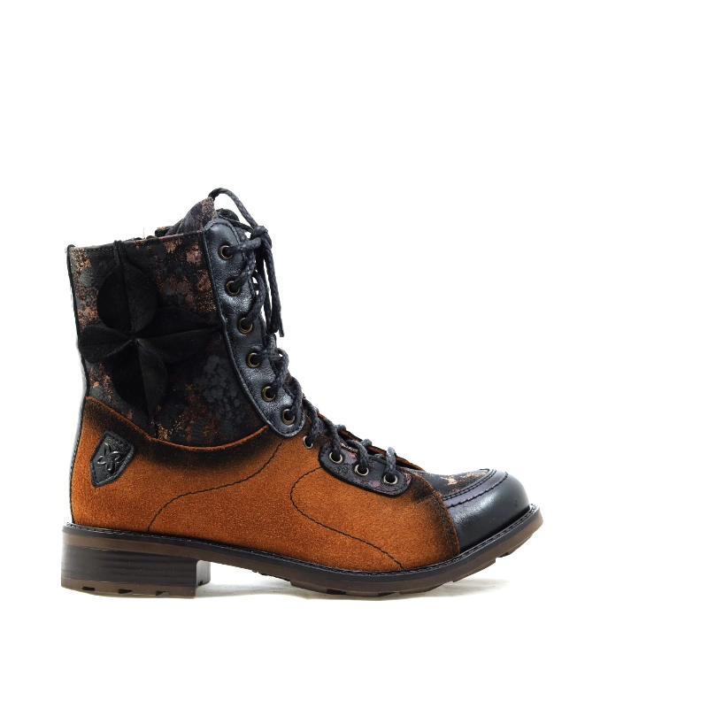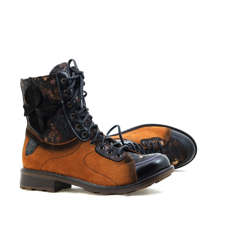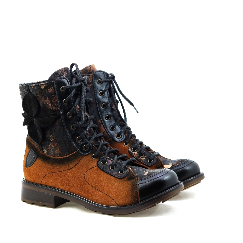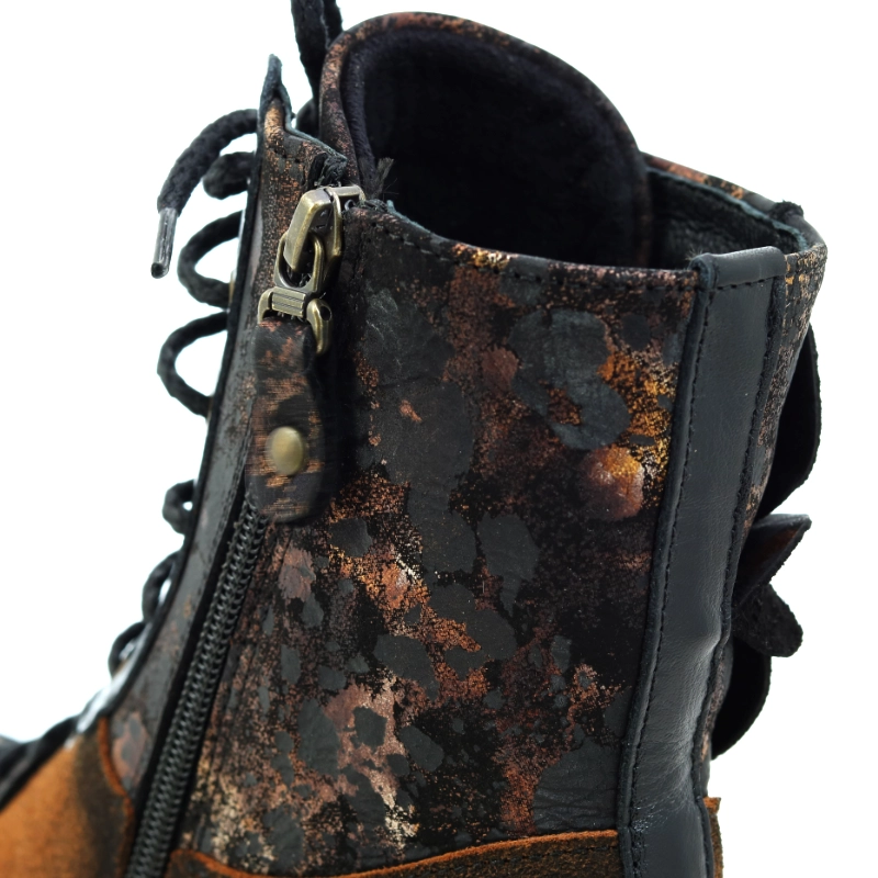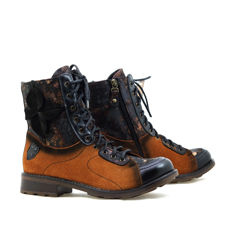 Model Maciejka 07004-29/00-8 to niezwykle oryginalne botki damskie o artystycznym charakterze, wykonane z połączenia naturalnej skóry i zamszu w ciepłych, jesiennych tonach brązu i czerni. Cholewka zdobiona subtelnym, kwiatowym detalem oraz przecieranym wykończeniem nadaje im wyjątkowego stylu vintage. Sznurowanie zapewnia idealne dopasowanie, a zamek po wewnętrznej stronie ułatwia zakładanie. Stabilny, niski obcas i solidna podeszwa gwarantują wygodę w codziennym użytkowaniu, czyniąc ten model idealnym wyborem dla kobiet ceniących niebanalne dodatki i indywidualny styl.