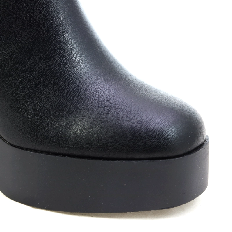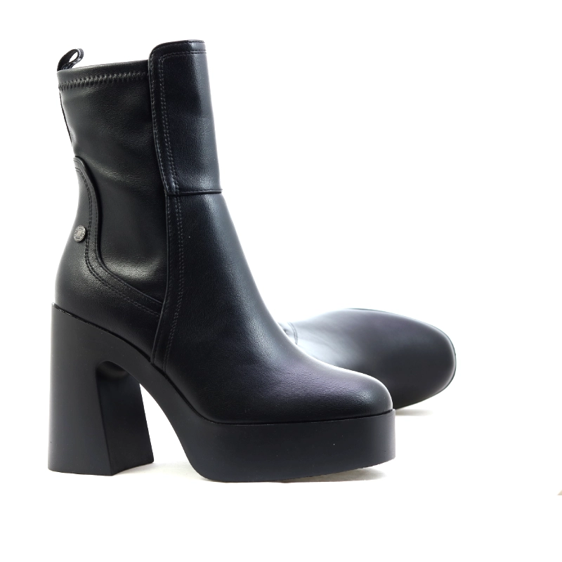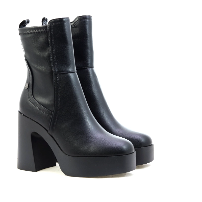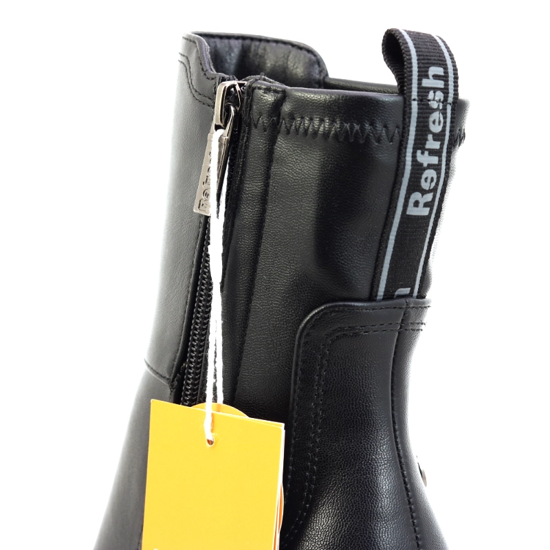 Model Refresh 171434 to modne botki damskie w klasycznym czarnym kolorze, które łączą minimalistyczny design z wyrazistym charakterem. Wykonane z wysokiej jakości skóry ekologicznej, osadzone na masywnej platformie i wysokim, szerokim obcasie, zapewniają stabilność i wygodę mimo imponującej wysokości. Gładka cholewka o średniej długości subtelnie wydłuża sylwetkę, a zamek po wewnętrznej stronie ułatwia zakładanie. To model stworzony dla kobiet, które lubią odważny, nowoczesny styl — idealnie pasuje do płaszczy oversize, skórzanych kurtek czy krótkich sukienek w miejskich stylizacjach.