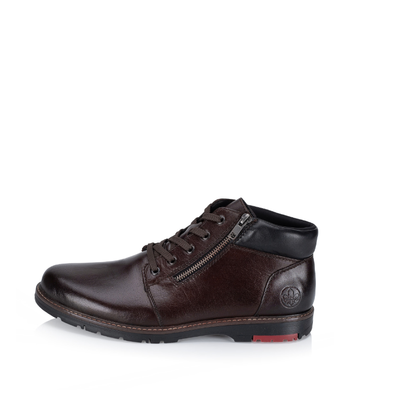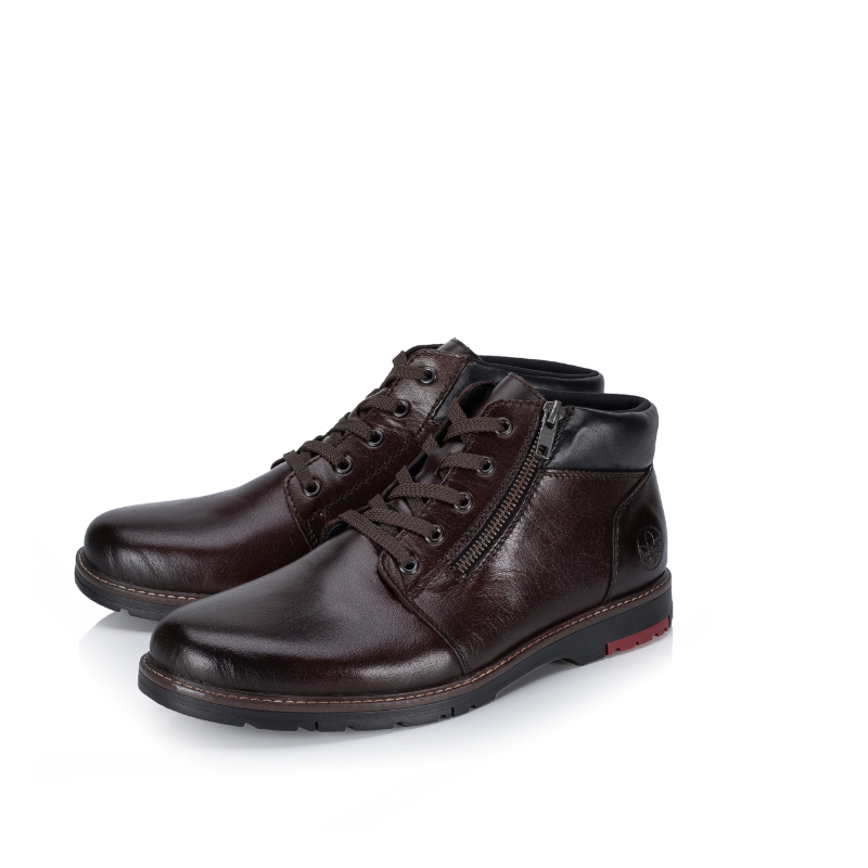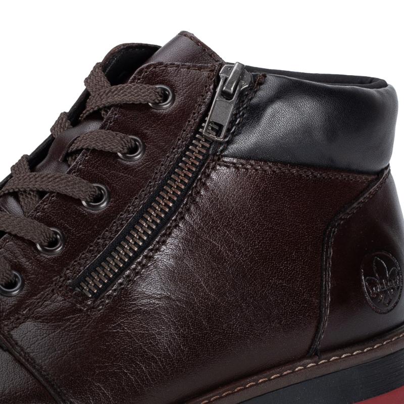 Męskie buty zimowe firmy RIEKER ze skórzaną cholewką ozdobioną logo marki na pięcie. Dzięki sznurowadłom do sznurowania możesz dopasować buty dokładnie według własnych upodobań, a funkcjonalny zamek błyskawiczny na podbiciu ułatwia zakładanie butów. Dzięki miękkiej wkładce i elastycznej podeszwie możesz cieszyć się komfortowym i komfortowym chodzeniem przez cały dzień. Ocieplany model z prawdziwej owczej wełny, który zachwyci i ogrzeje Cię zimą.