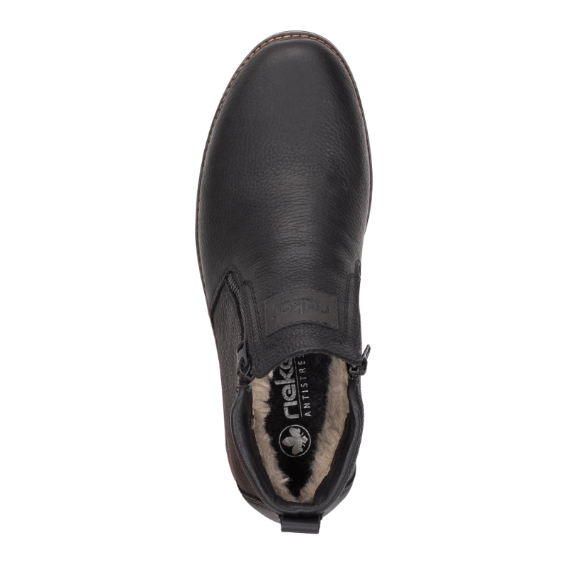 Te buty RIEKER łączą nowoczesny wygląd z praktycznym zastosowaniem na co dzień. Wysokiej jakości, czarna, skórzana cholewka ozdobiona jest naszywką z logo marki, która podkreśla jakość i wyjątkowość tego modelu. Zakładanie butów ułatwiają dwa boczne zamki błyskawiczne na podbiciu, które dodatkowo dodają butom ciekawego charakteru. Wewnętrzna, ocieplana wkładka zapewnia komfort termiczny w chłodne dni, a podeszwa amortyzuje wstrząsy podczas chodzenia. Ten uniwersalny model świetnie pasuje do jeansów i spodni – idealny towarzysz do pracy i wypoczynku.