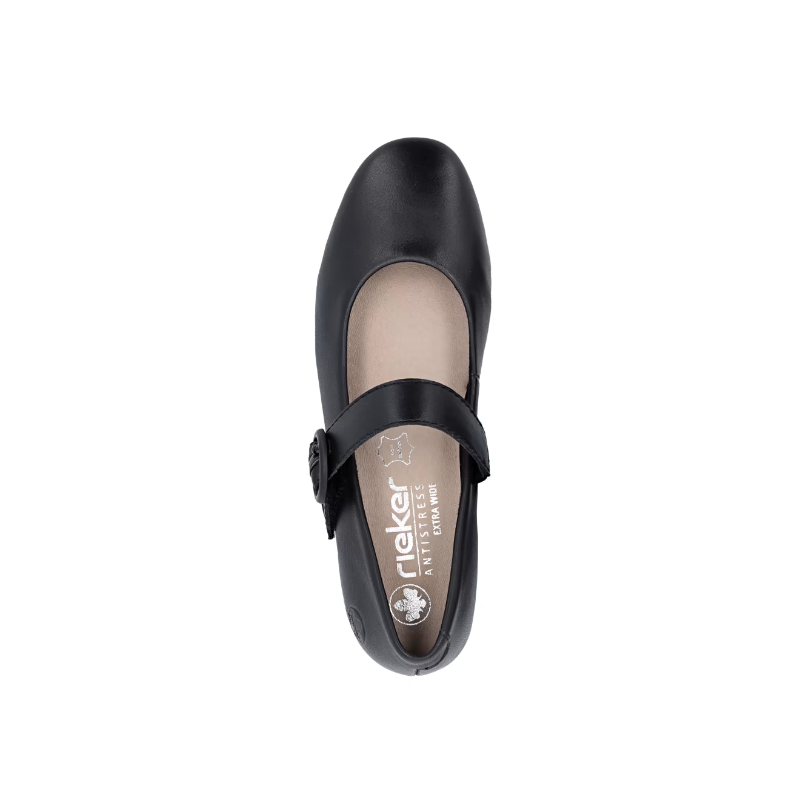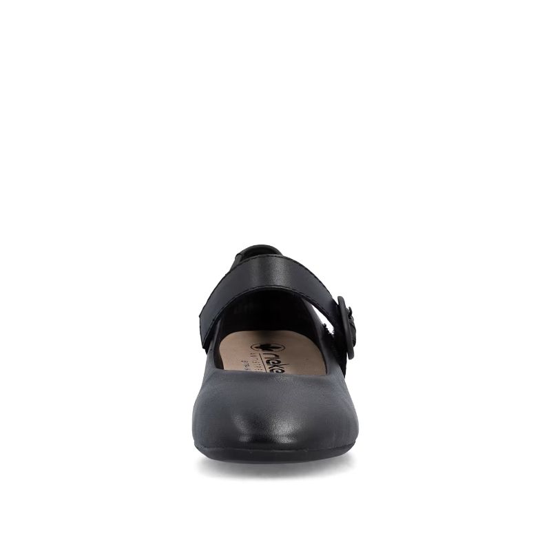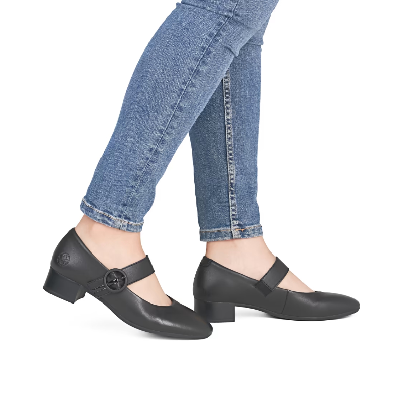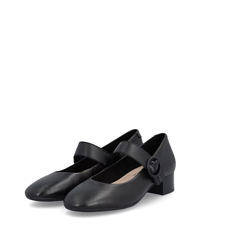 Skórzane czółenka RIEKER przyciągają uwagę prostą, czarną cholewką, która wygląda elegancko i ponadczasowo jednocześnie. Charakterystycznym detalem jest pasek na podbiciu, który jest nie tylko elementem designu, ale dzięki możliwości regulacji przyczynia się również do wygodnego i stabilnego dopasowania buta do stopy. Niski i szeroki obcas gwarantuje stabilność podczas chodzenia i nadaje modelowi kobiecy, a jednocześnie praktyczny charakter. Idealny wybór dla kobiet poszukujących wygodnych czółenek o wyrazistym wyglądzie - odpowiednich do pracy i na spotkania towarzyskie.