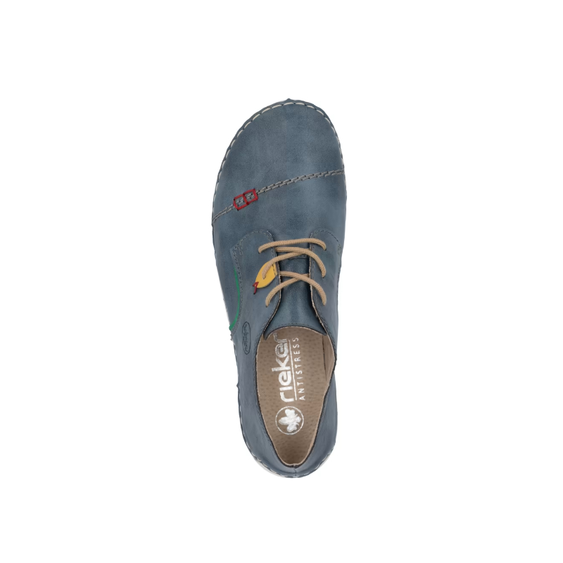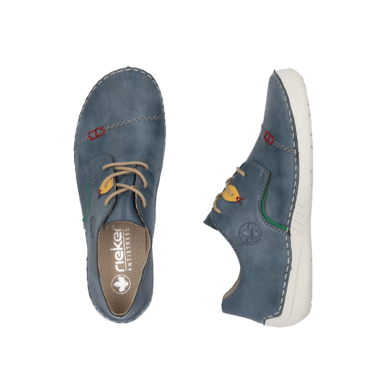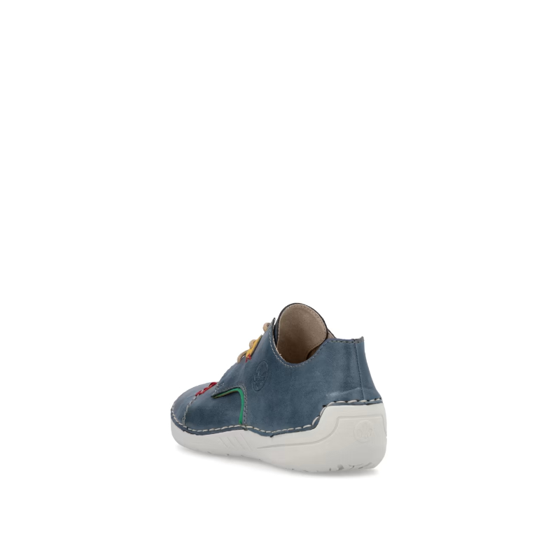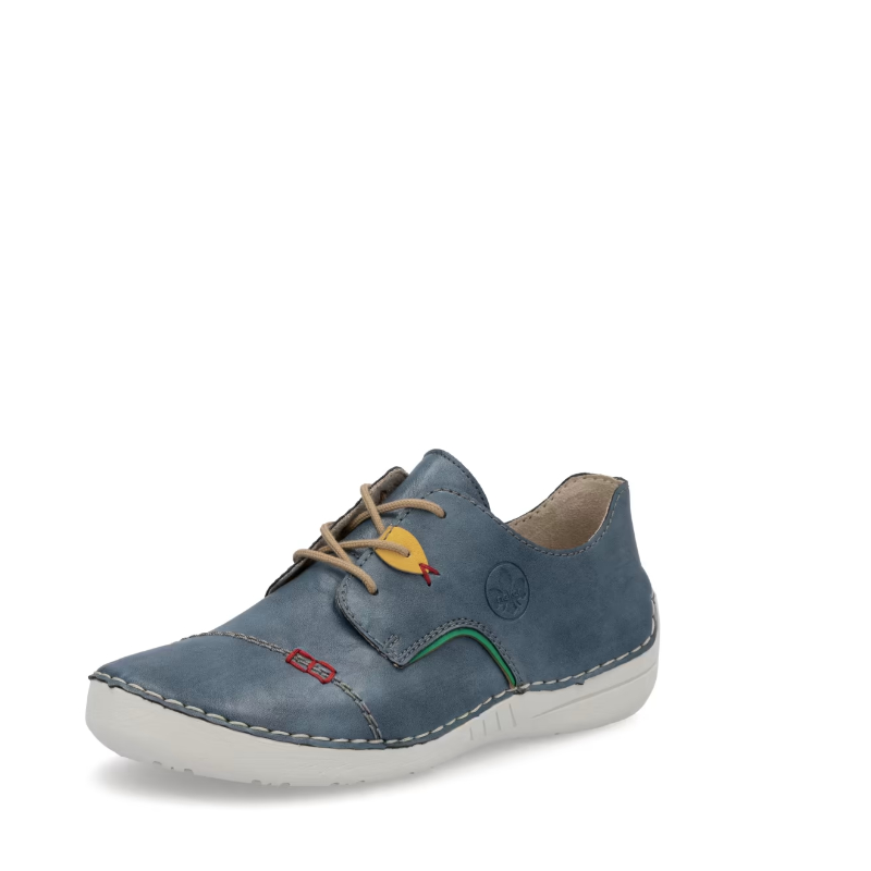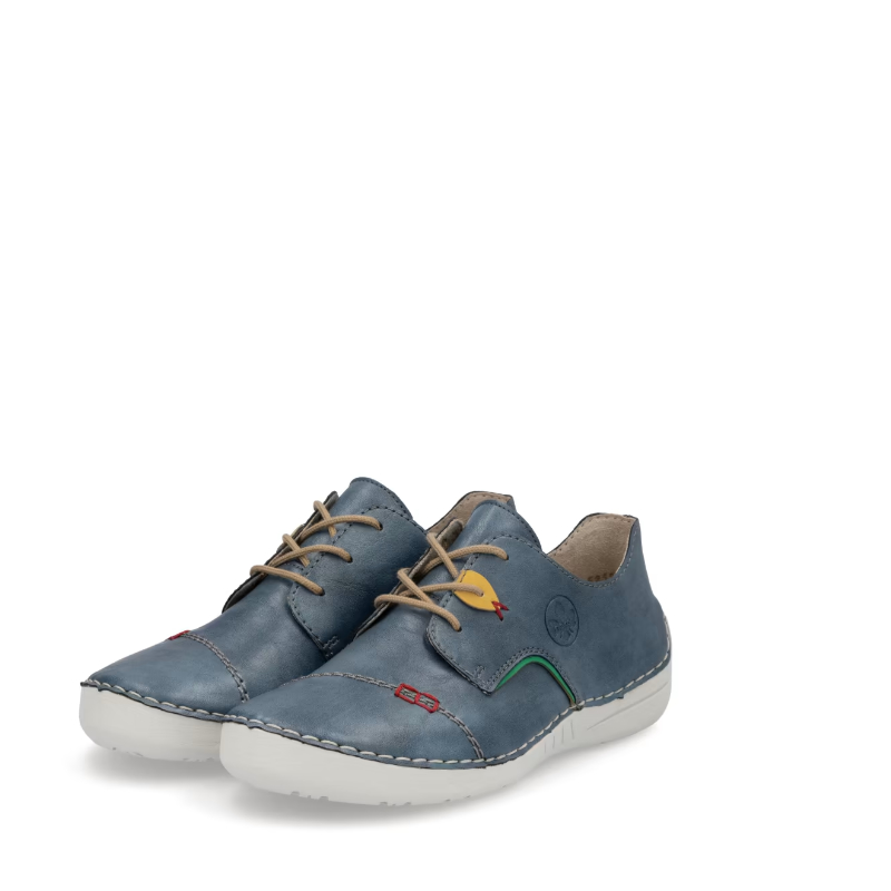 Damskie buty RIEKER w młodzieżowym, niebieskim kolorze to połączenie nowoczesnego designu i wygody, które docenisz podczas codziennego noszenia. Cholewka ozdobiona jest charakterystycznymi, ozdobnymi przeszyciami i kontrastującymi kolorami, które nadają butom dynamiczny wygląd. Na zewnątrz subtelne logo marki RIEKER stanowi dyskretny, ale efektowny detal, który podkreśla jakość wykonania. Styl całego modelu ożywiają kontrastujące brązowe sznurówki, które nie tylko wizualnie łagodzą kompozycję kolorystyczną, ale także pozwalają idealnie dopasować buty do kształtu stopy. Wewnętrzna, skórzana wkładka i podeszwa, które zapewniają butom elastyczność i amortyzację podczas chodzenia, zapewnią komfort nawet podczas dłuższego noszenia. Ten model to idealny wybór dla kobiet, które lubią uzupełniać swoją garderobę o elementy z charakterem – ich oryginalny wygląd z łatwością komponuje się z różnymi stylizacjami, od casualowych stylizacji po swobodny, miejski styl.