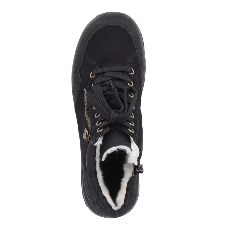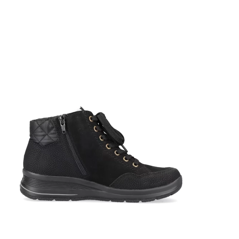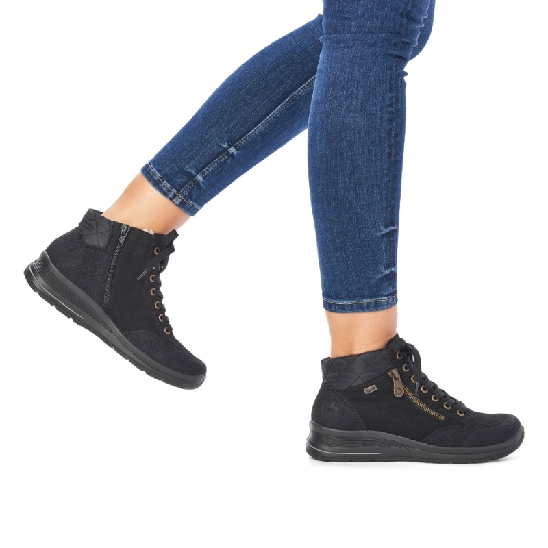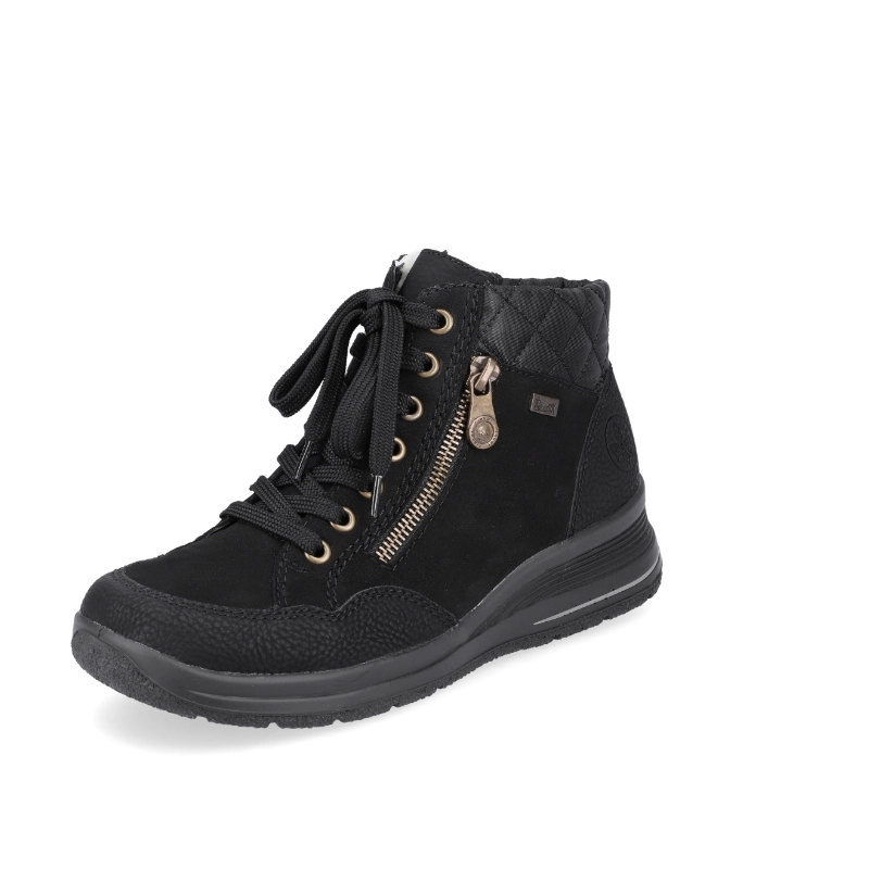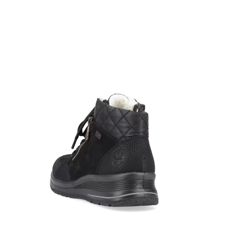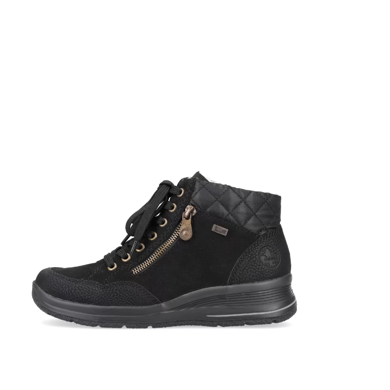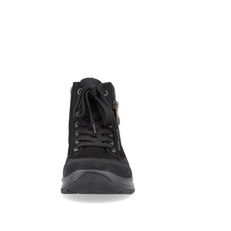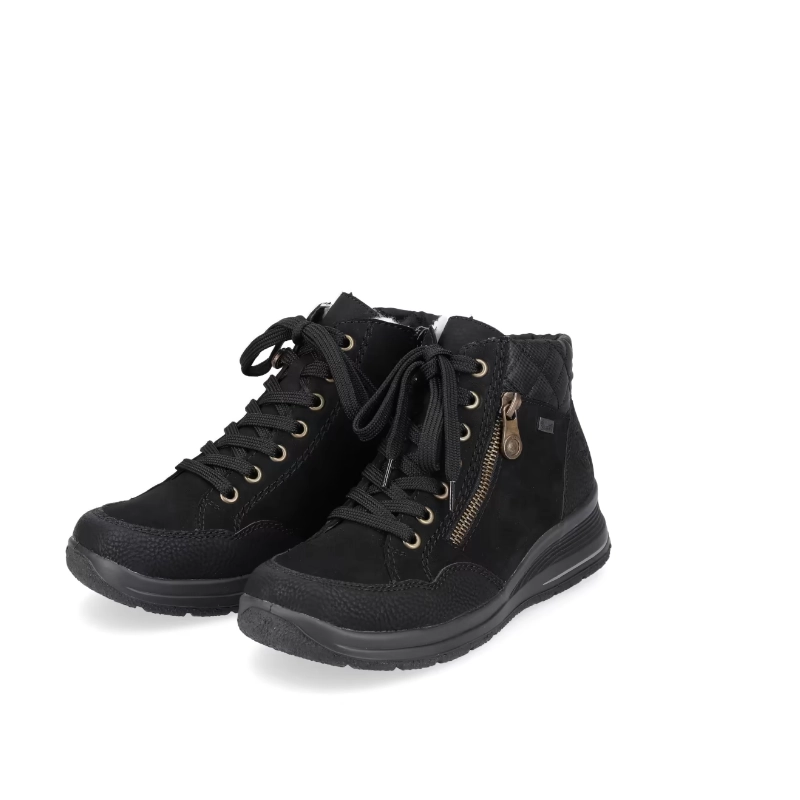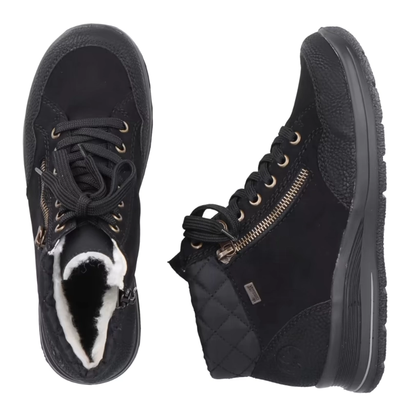 Stylowe botki RIEKER dzięki uniwersalnemu czarnemu kolorowi łatwo dopasują się do każdej stylizacji, a ich ponadczasowość może towarzyszyć Ci każdego dnia. Cholewka zachwyca pomysłowym połączeniem materiałów, uzupełnionym charakterystycznym logo marki w okolicy pięty i ozdobnym zamkiem błyskawicznym na podbiciu, który dopełnia modny wygląd. Praktyczne sznurowanie w połączeniu z bocznym zamkiem błyskawicznym zapewnia wygodę noszenia. Ocieplana podszewka zapewnia niezbędny komfort termiczny w chłodne dni, a membrana TEX chroni przed wilgocią i zapewnia oddychalność. Połączenie funkcjonalności i modnego designu gwarantuje, że będziesz ciepło i stylowo ubrany przez całą zimę.
