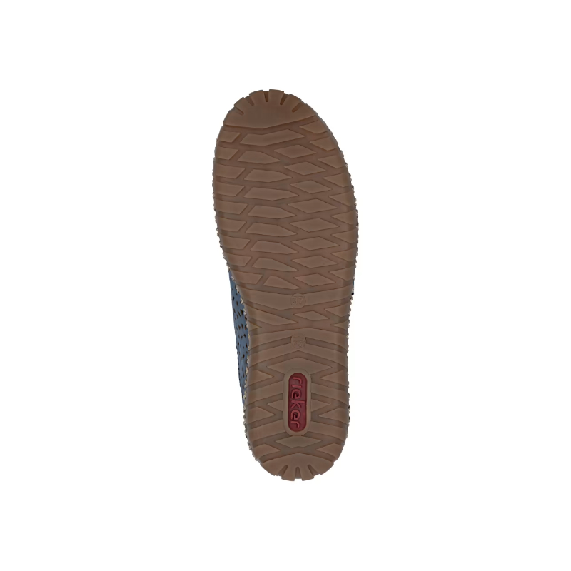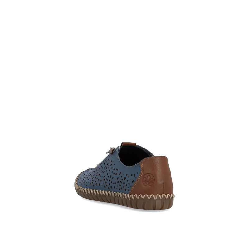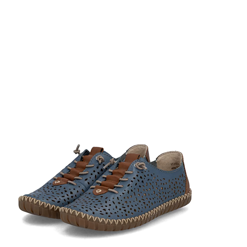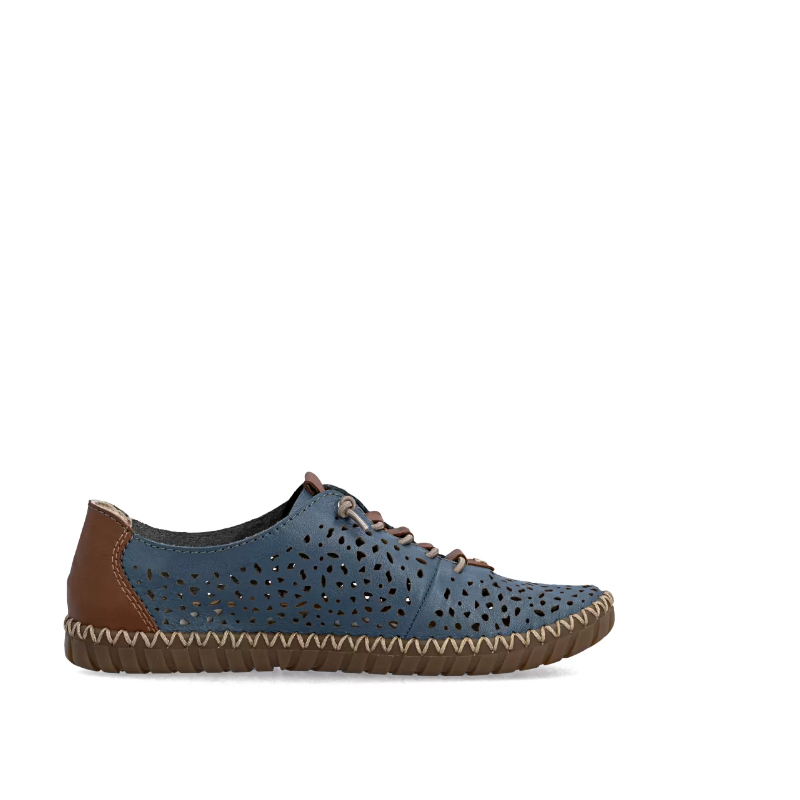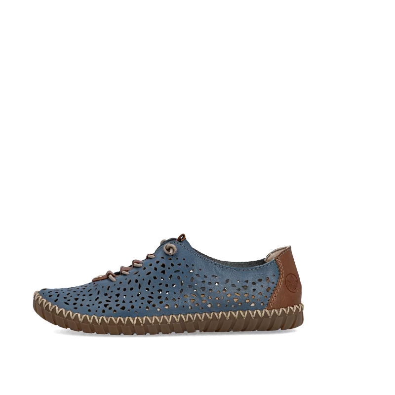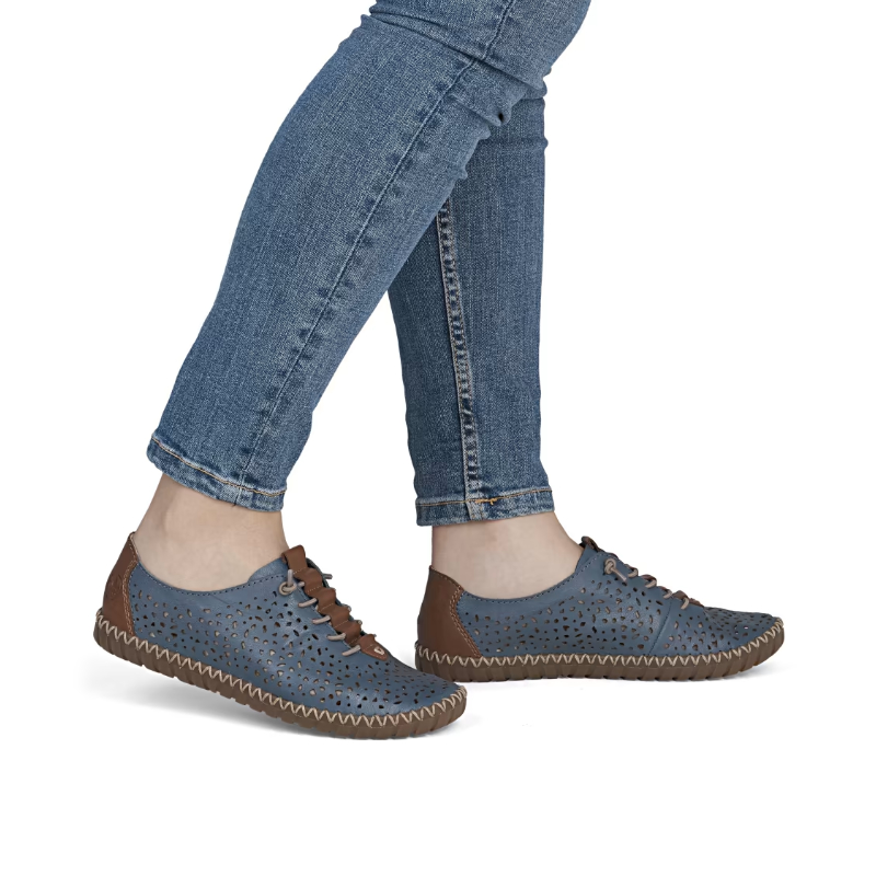 Niepowtarzalny design butów RIEKER przypadnie do gustu każdej kobiecie o wyrafinowanym poczuciu mody. Niebieska cholewka z delikatnymi perforacjami prezentuje się elegancko i zwiewnie, a brązowe, kontrastowe aplikacje nadają modelowi modnego charakteru. Praktyczna gumka zamiast sznurowania zapewnia wygodę noszenia i idealne dopasowanie do stopy. Wyjmowana, tekstylna wkładka zapewnia komfort nawet podczas całodziennego noszenia, a elastyczna podeszwa skutecznie amortyzuje wstrząsy podczas chodzenia. Te półbuty to idealny wybór dla kobiet ceniących styl, jakość i niezrównany komfort.