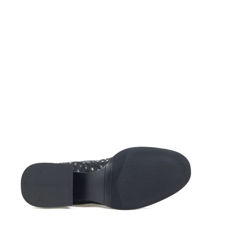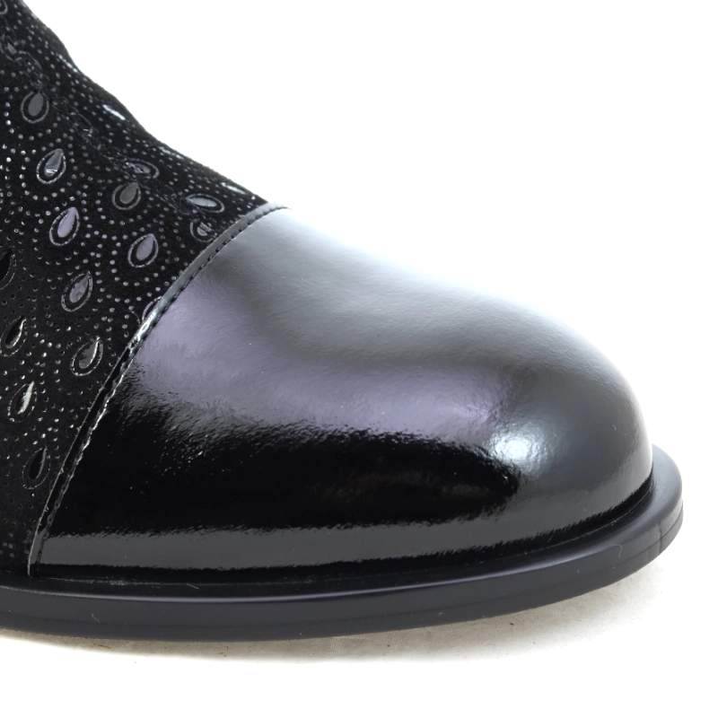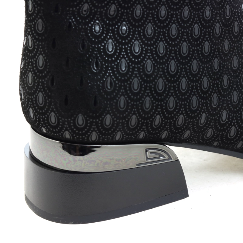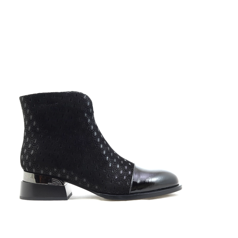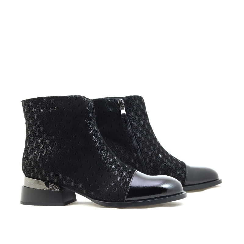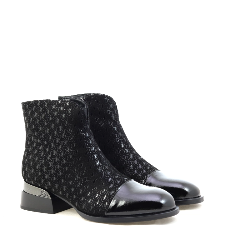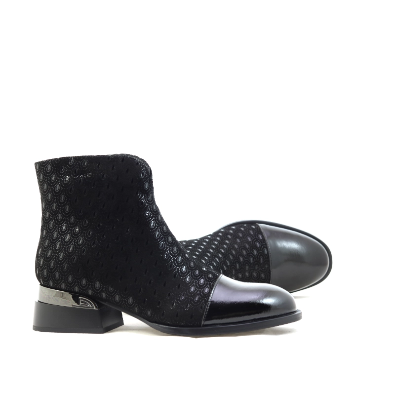 Model S. Barski JC52-862 to wyjątkowe czarne botki, które łączą elegancję z nowoczesnym charakterem. Wykonane z materiału o subtelnym, tłoczonym wzorze przypominającym koronkę, przyciągają uwagę połyskującym noskiem ze skóry lakierowanej i metalicznym akcentem na obcasie. Zamek błyskawiczny po wewnętrznej stronie zapewnia wygodę zakładania, a niski, stabilny obcas gwarantuje komfort noszenia przez cały dzień. To doskonały wybór dla kobiet ceniących szyk w codziennych stylizacjach i chcących dodać im odrobiny klasy z nutą glamour.