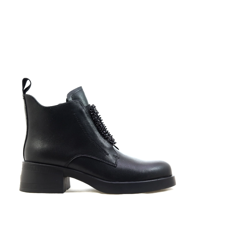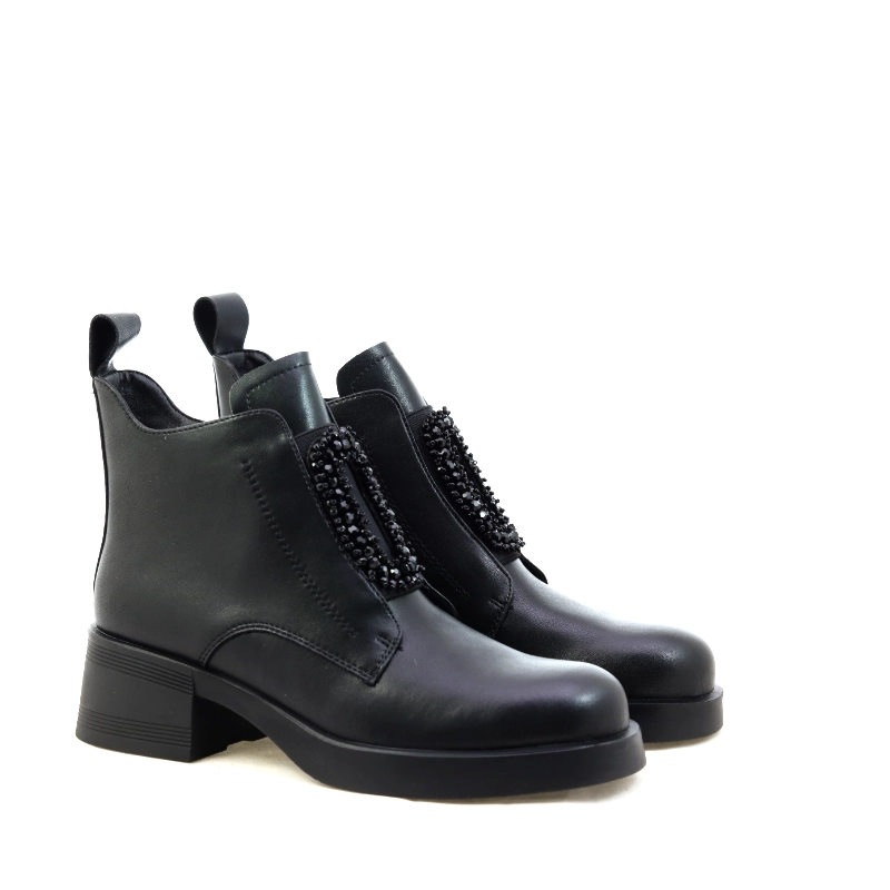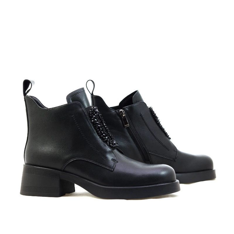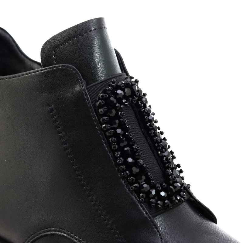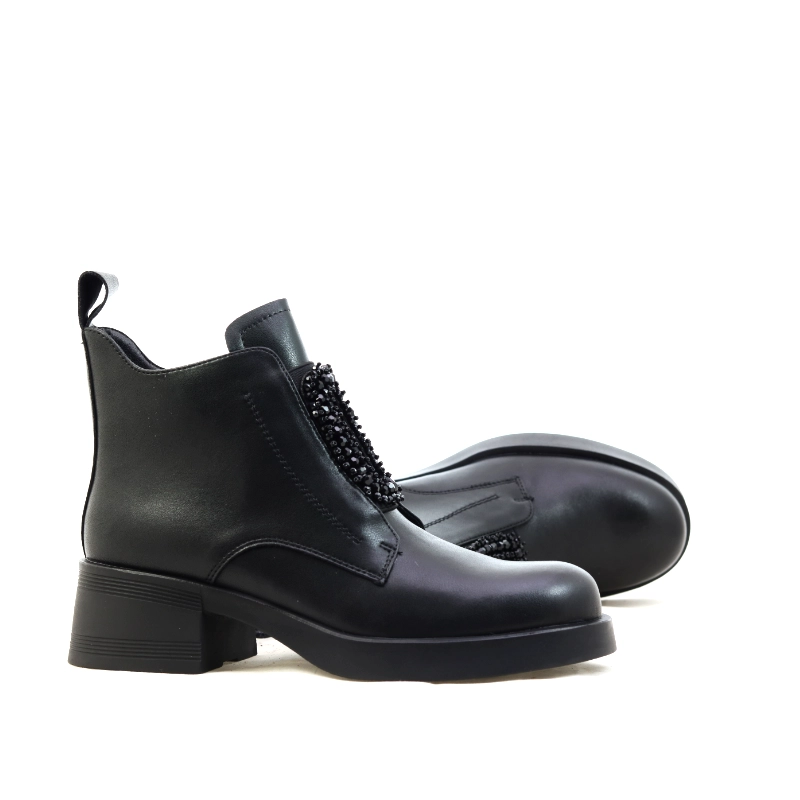Model S. Barski JC52-869 to eleganckie czarne botki o nowoczesnym charakterze, wykonane z wysokiej jakości skóry ekologicznej. Minimalistyczną formę urozmaica efektowna ozdoba z drobnych czarnych koralików umieszczona z przodu, która nadaje całości wyjątkowego, biżuteryjnego akcentu. Stabilny, niski obcas zapewnia wygodę podczas chodzenia, a elastyczne wstawki po bokach ułatwiają zakładanie i dopasowanie do stopy. To doskonały wybór dla kobiet ceniących połączenie klasy, wygody i subtelnego blasku w codziennych stylizacjach.