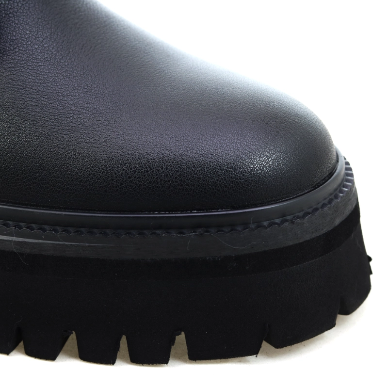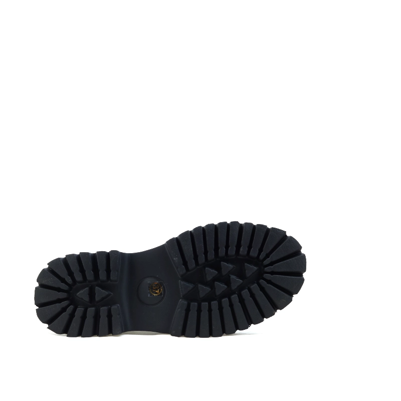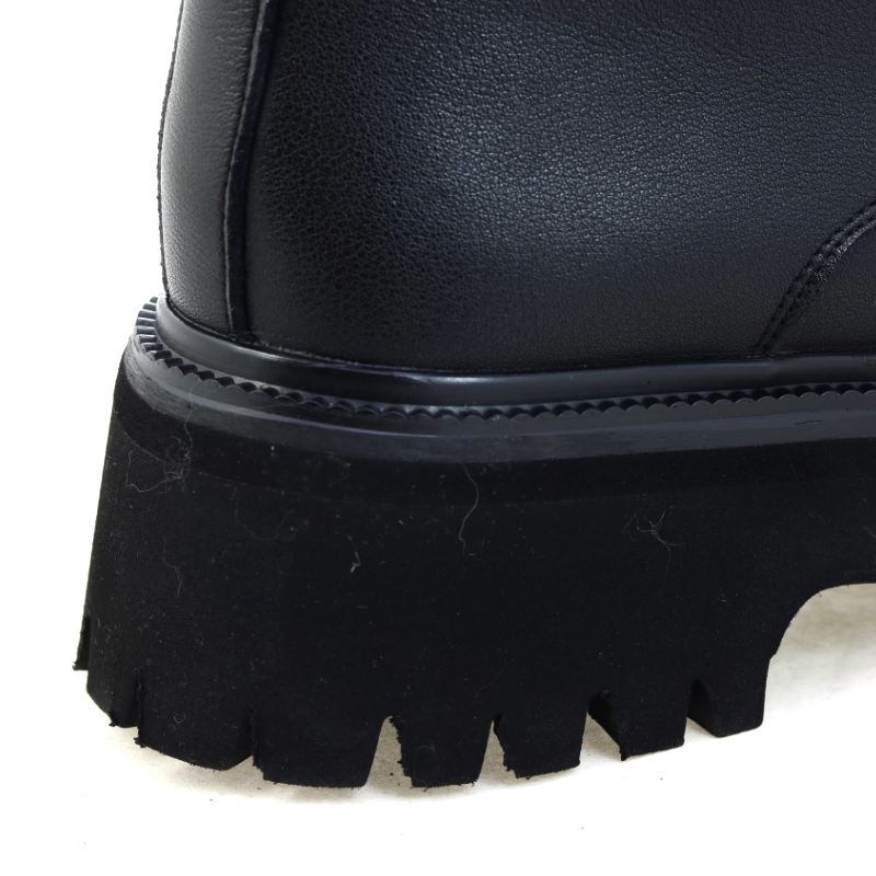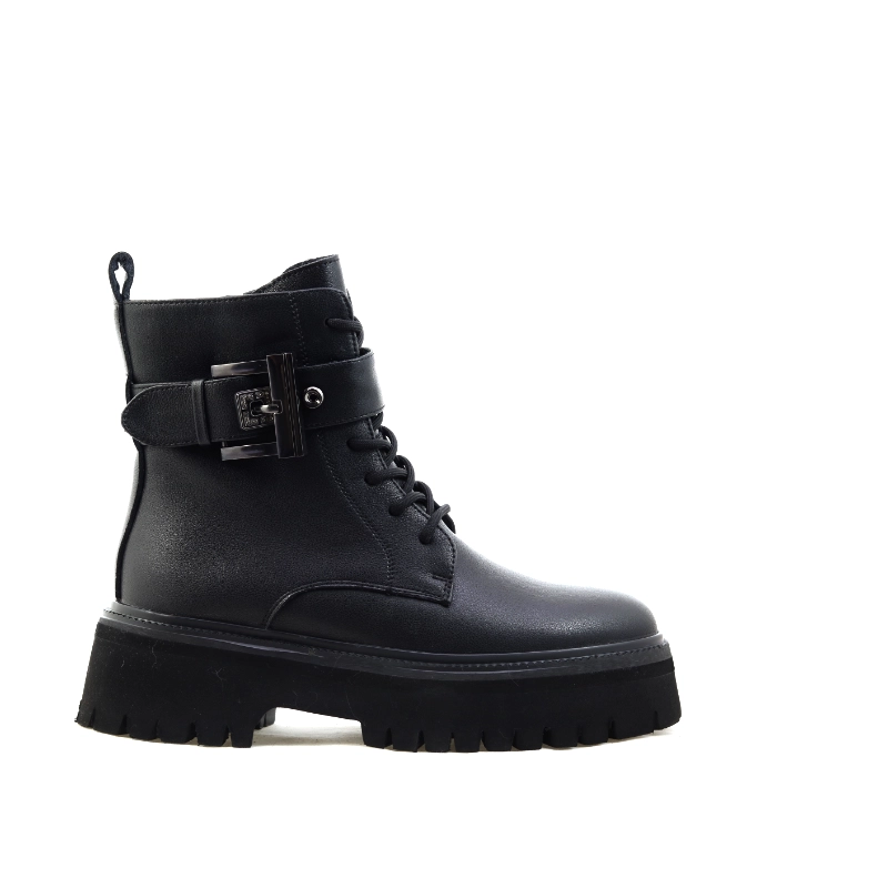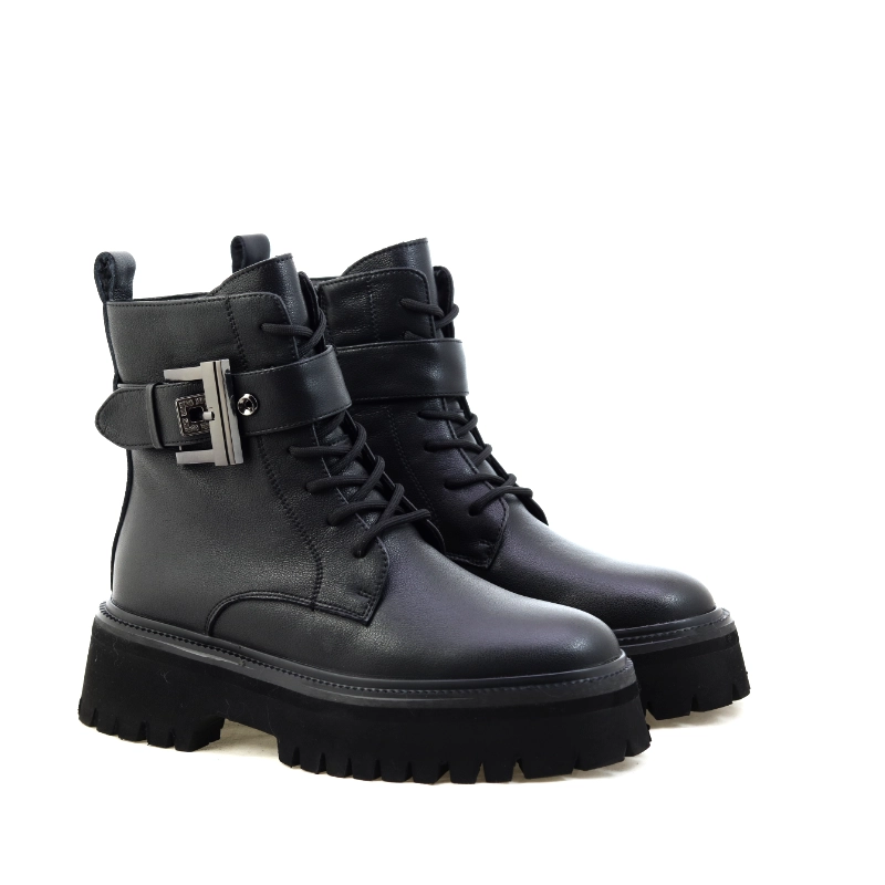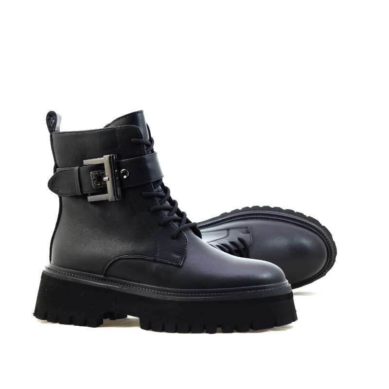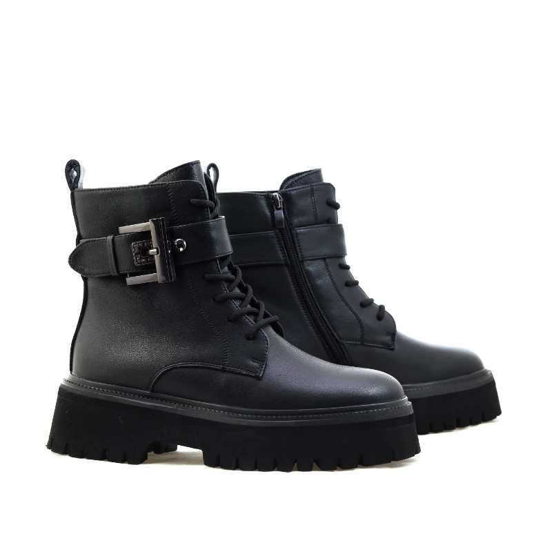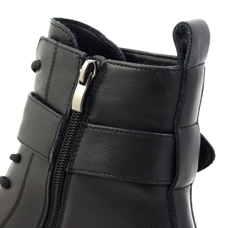 Model S. Barski MK52-032 to masywne, czarne botki o wyrazistym, militarnym charakterze. Wykonane z wysokogatunkowej skóry ekologicznej, osadzone na grubej, solidnej podeszwie z głębokim bieżnikiem gwarantującej stabilność i komfort noszenia. Ozdobna, metalowa klamra w odcieniu srebra umieszczona na pasku wokół cholewki dodaje im nowoczesnego i odważnego stylu, a klasyczne sznurowanie pozwala dopasować obuwie do stopy. Idealne na chłodniejsze dni, świetnie komponują się zarówno z jeansami, jak i bardziej kobiecymi stylizacjami, wprowadzając do nich odrobinę rockowego pazura.