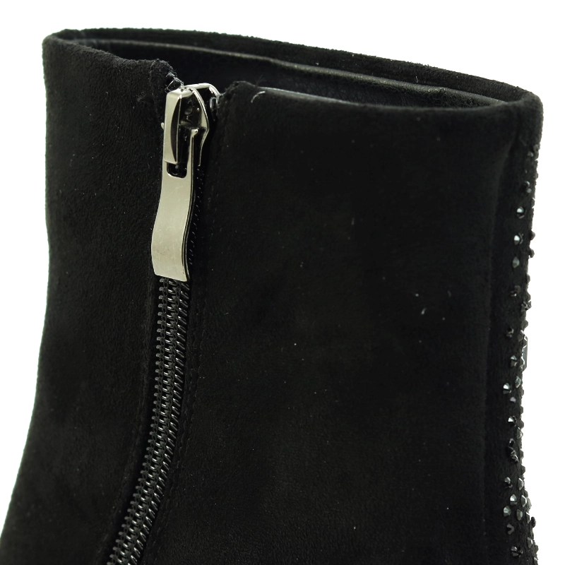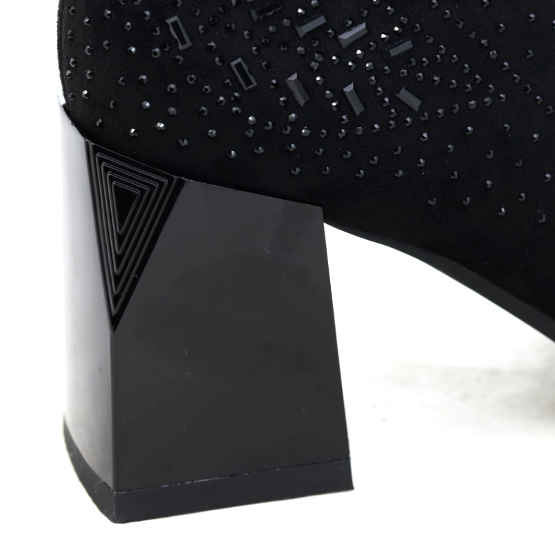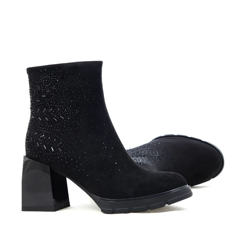 Model S. Barski MR52-101 to eleganckie botki damskie w kolorze czarnym, które łączą kobiecość z komfortem noszenia. Wykonane z miękkiego zamszu ekologicznego, ozdobione subtelnym, błyszczącym wzorem z drobnych dżetów i koralików, przyciągają uwagę wyrafinowanym detalem. Stabilny, lakierowany obcas o geometrycznym kształcie nadaje całości nowoczesnego wyglądu, a grubsza podeszwa zapewnia doskonałą przyczepność. Zamek od wewnętrznej strony ułatwia zakładanie, a delikatne ocieplenie wewnątrz gwarantuje komfort w chłodniejsze dni. To doskonały wybór do eleganckich, jesienno-zimowych stylizacji z klasą.
