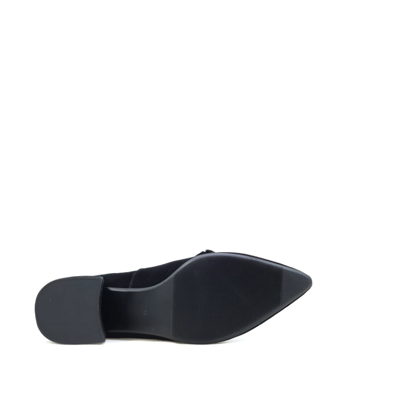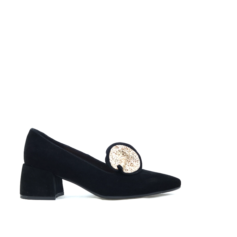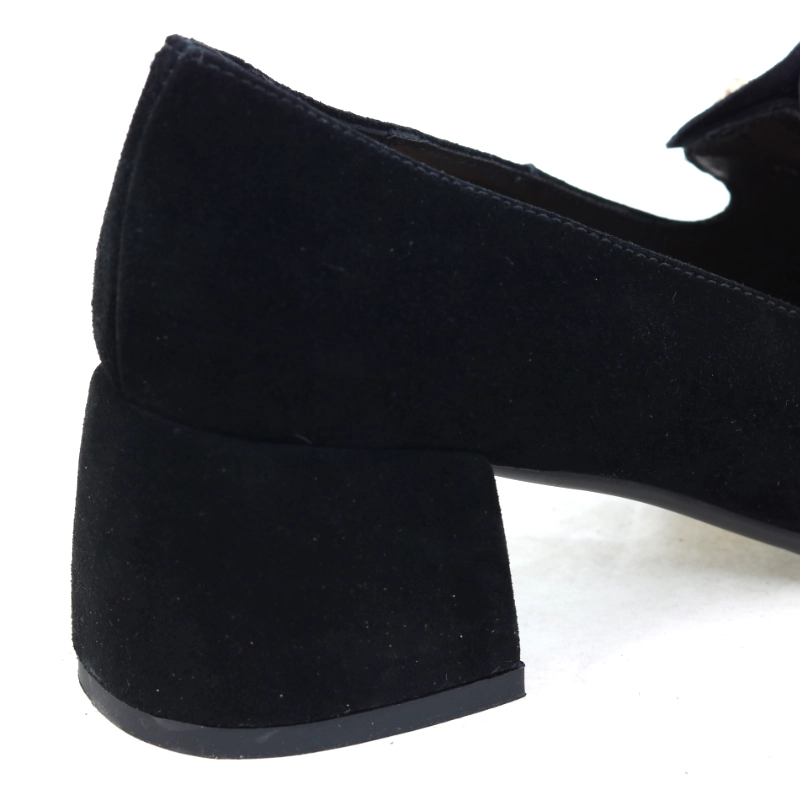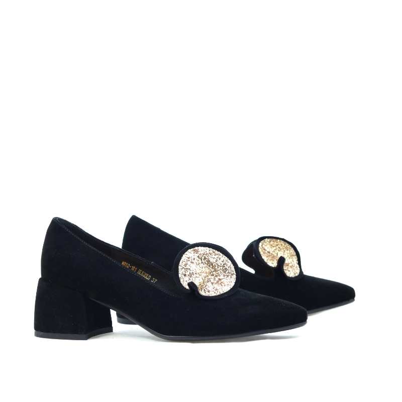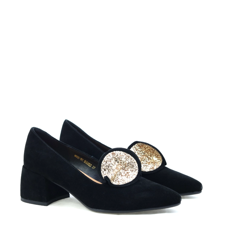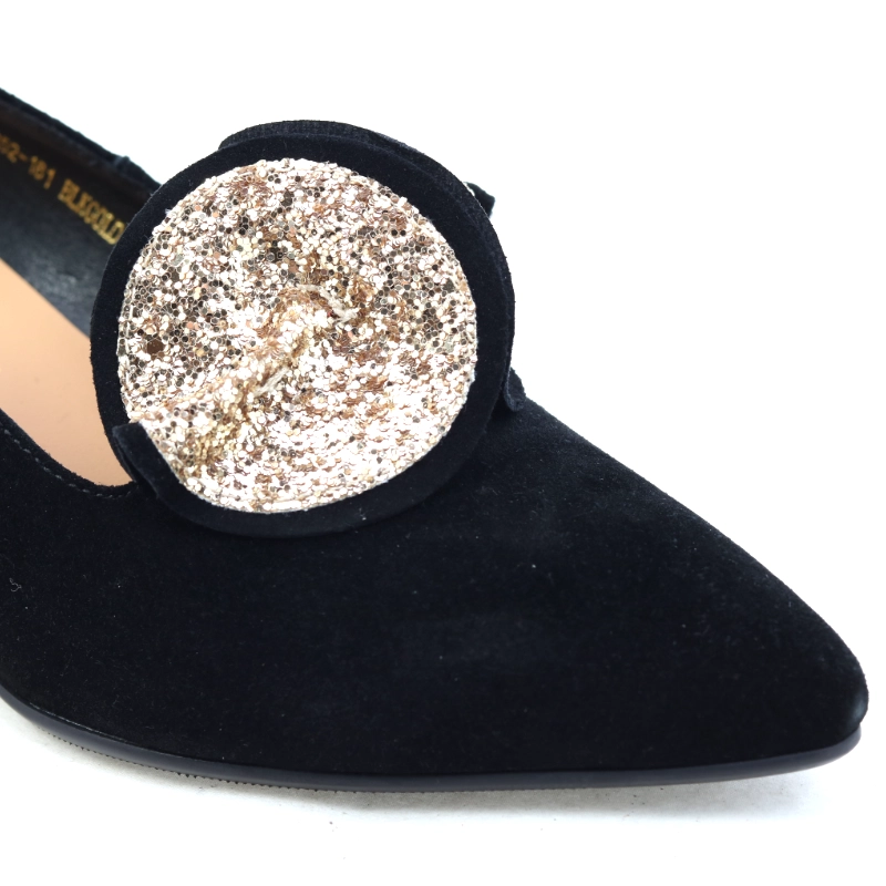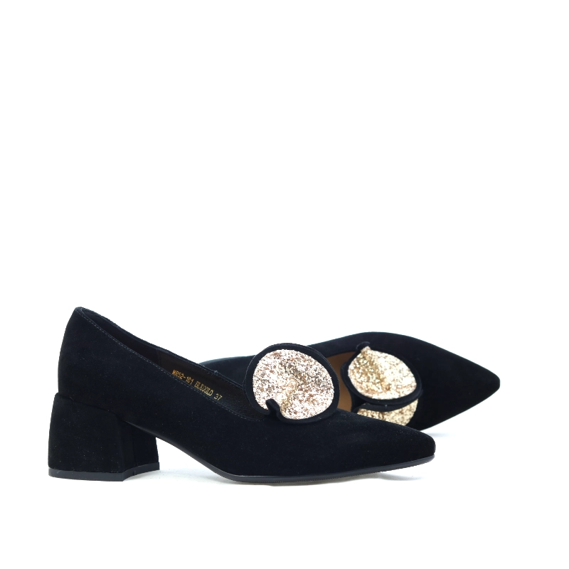 Model S. Barski MR52-181 to wyjątkowe czółenka w eleganckim, czarnym kolorze, wykonane z miękkiego zamszu, które urzekają złotym, połyskującym akcentem na przodzie w formie dużej ozdoby. Stabilny, szeroki obcas zapewnia komfort noszenia przez cały dzień, a smukły nosek optycznie wysmukla stopę. To idealne połączenie klasyki z nutą glamour — doskonałe zarówno do eleganckich stylizacji biurowych, jak i wieczorowych kreacji.