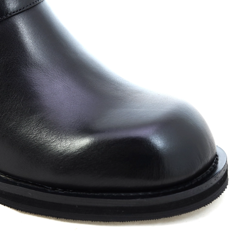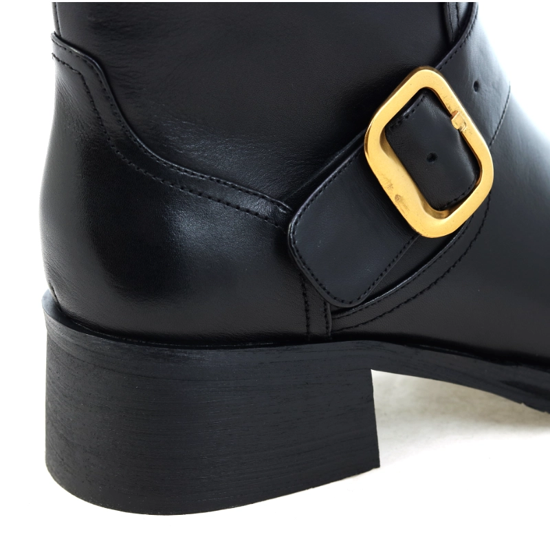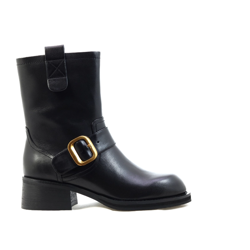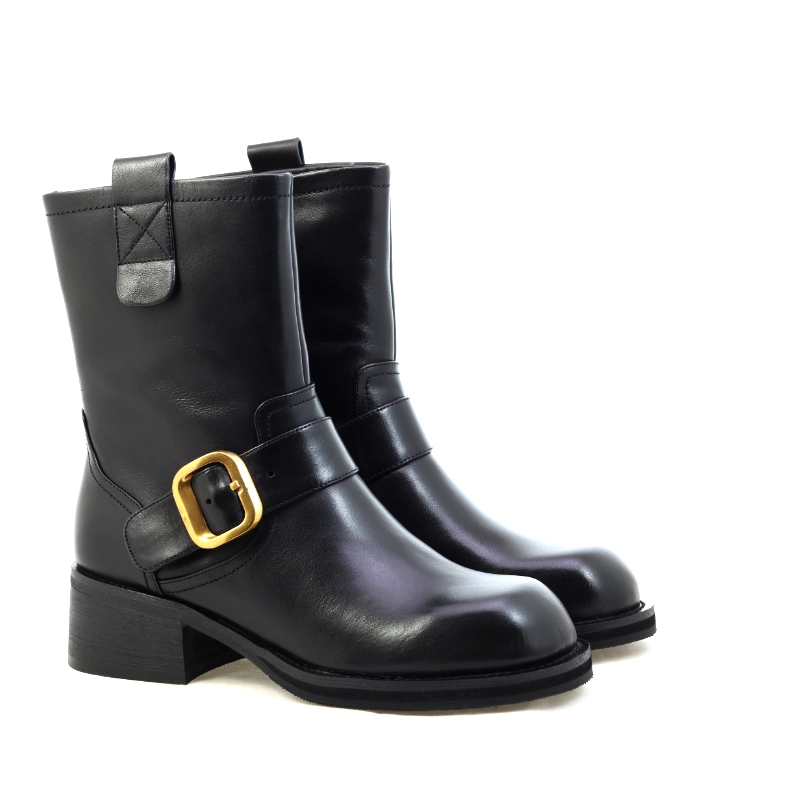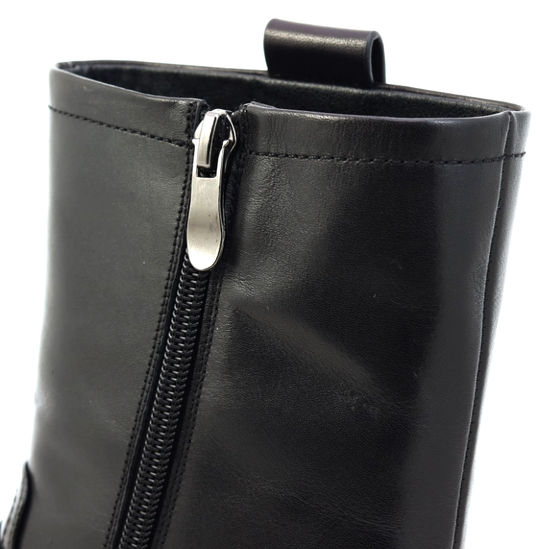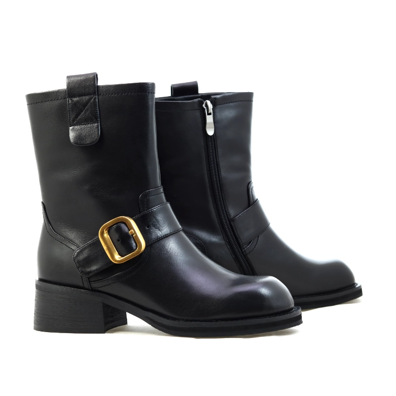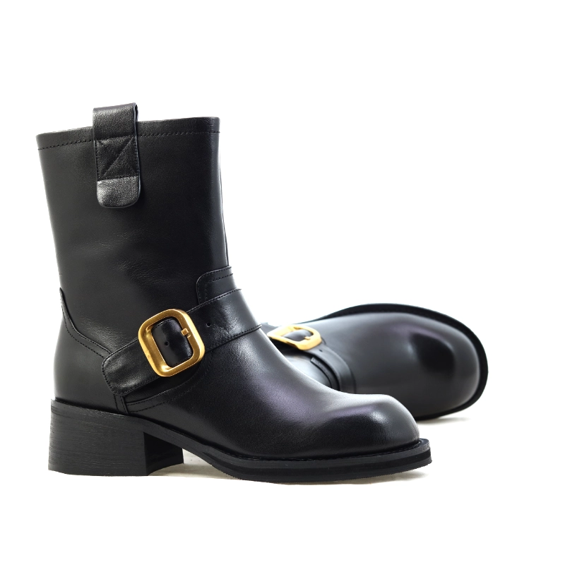 Model Venezia V440-00790-01BLA to eleganckie, czarne botki damskie wykonane z wysokiej jakości naturalnej skóry, które łączą klasykę z nutą nowoczesnego stylu. Prosta cholewka sięgająca połowy łydki została ozdobiona szerokim paskiem z efektowną, złotą klamrą, nadając butom charakteru i elegancji. Stabilny obcas typu klocek zapewnia wygodę podczas codziennego noszenia, a zamek po wewnętrznej stronie ułatwia zakładanie. Miękkie, polarowe ocieplenie wewnątrz gwarantuje komfort i ciepło w chłodniejsze dni, a usztywniane noski i zapiętki dbają o trwałość i dobre dopasowanie. To idealny model do codziennych i casualowych stylizacji, który doda charakteru każdemu zestawowi.