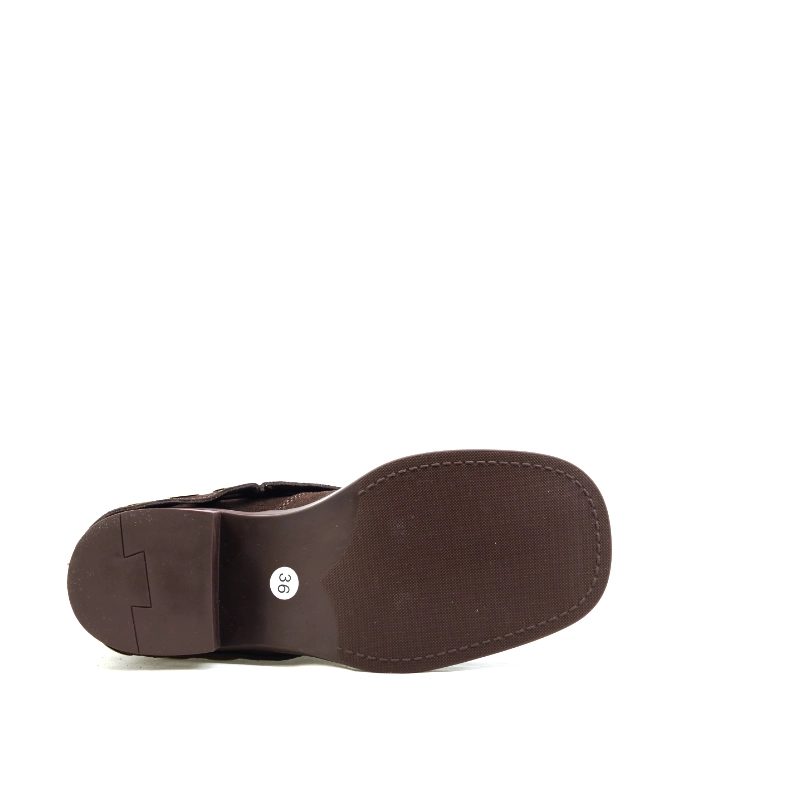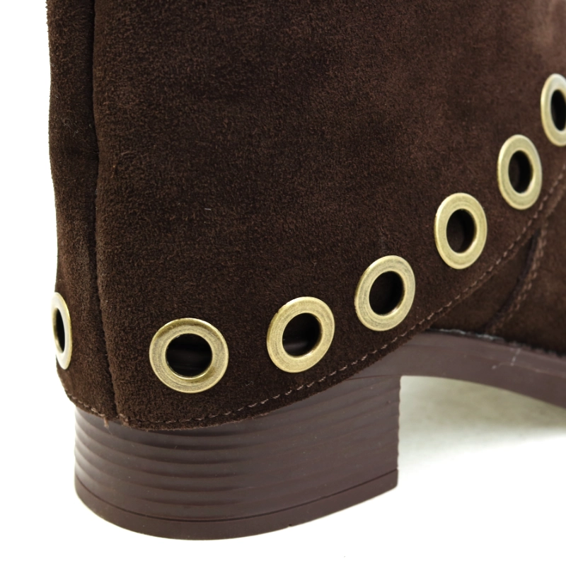 Model Venezia V443-00822-02BRO to stylowe botki damskie wykonane z naturalnego zamszu w głębokim, czekoladowym odcieniu brązu. Wywinięta cholewka o prostym kroju została ozdobiona rzędem metalowych oczek w kolorze starego złota, które nadają butom modnego, swobodnego charakteru. Zaokrąglony nosek i niski, szeroki obcas gwarantują komfort podczas codziennego noszenia. Wsuwany fason sprawia, że buty są wyjątkowo praktyczne. To idealny model do jesiennych stylizacji w stylu casual i boho — świetnie komponuje się zarówno z jeansami, jak i z dzianinową sukienką.