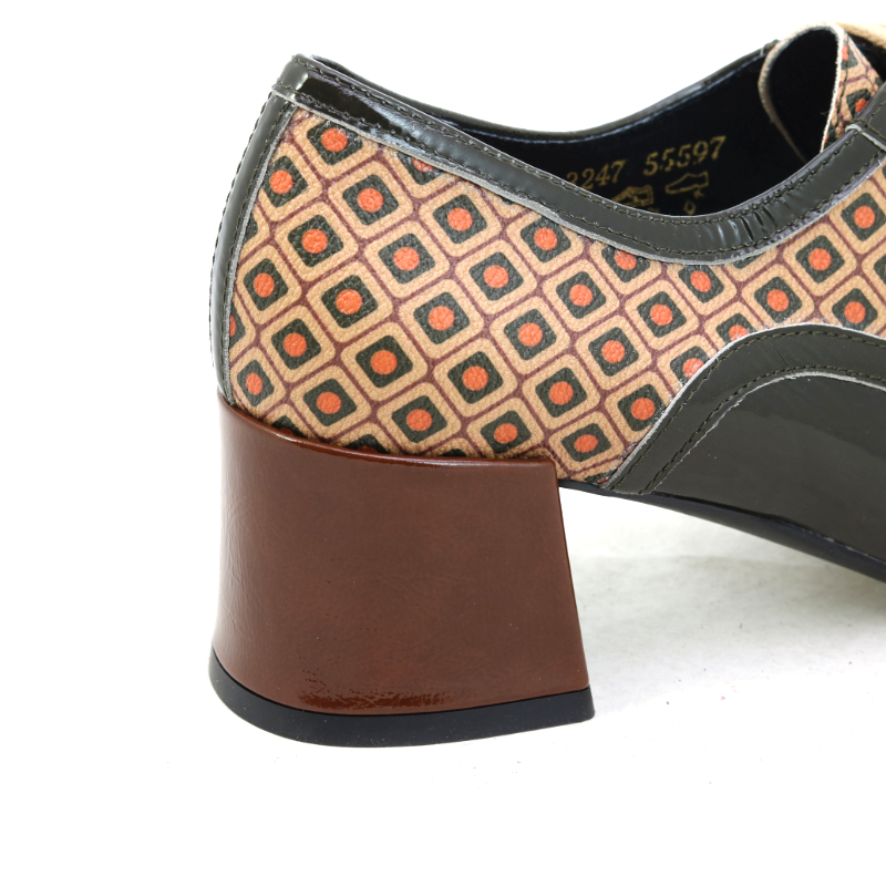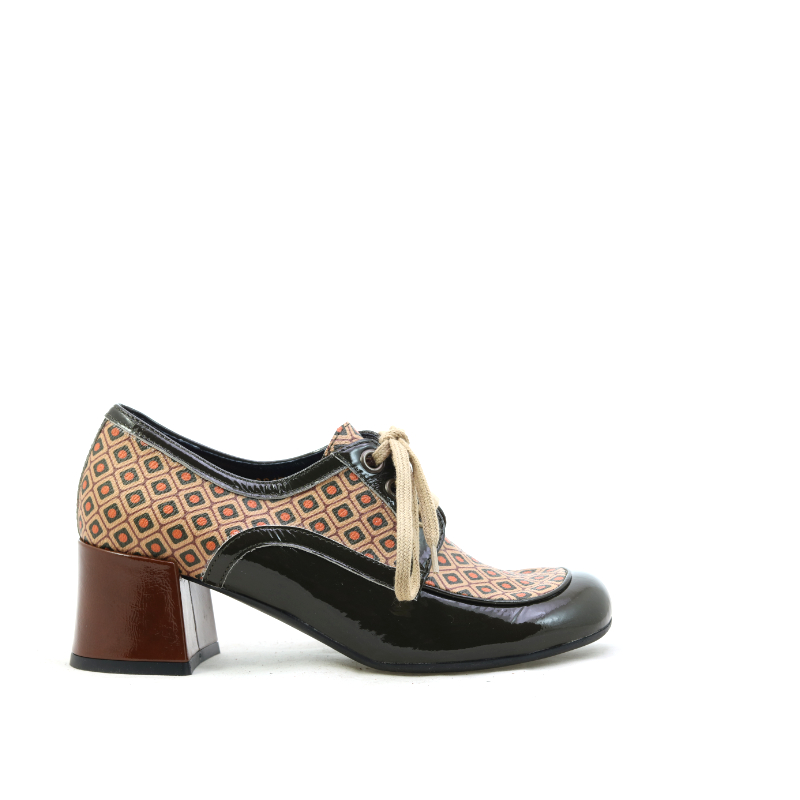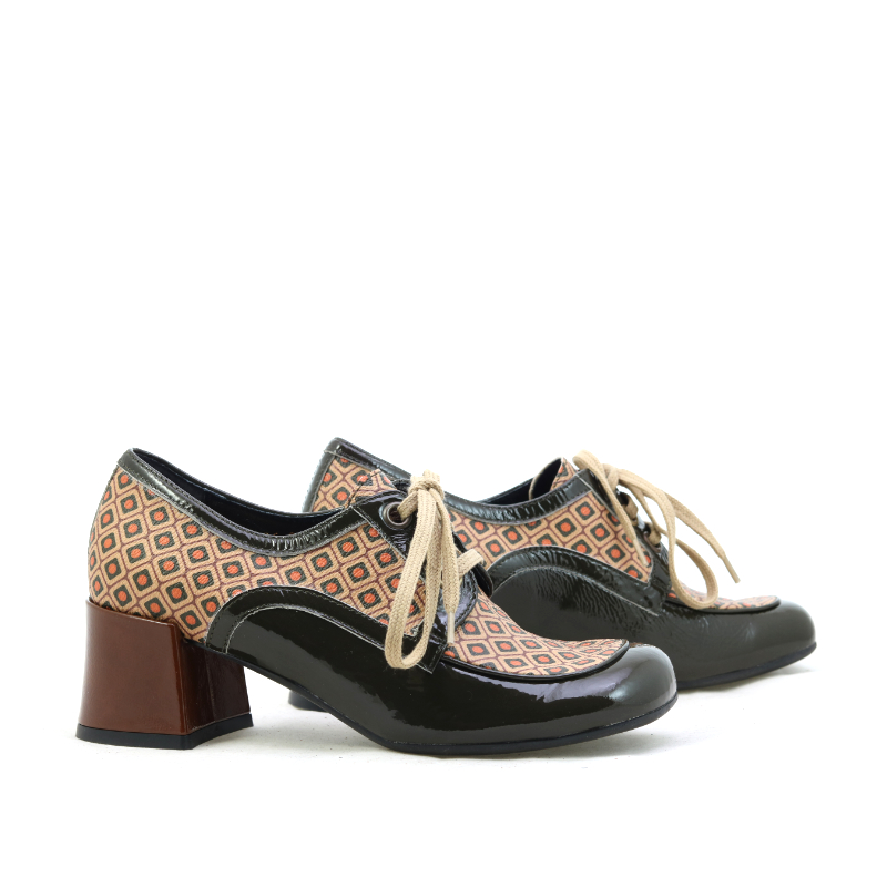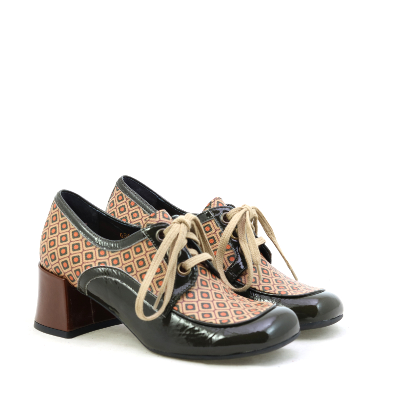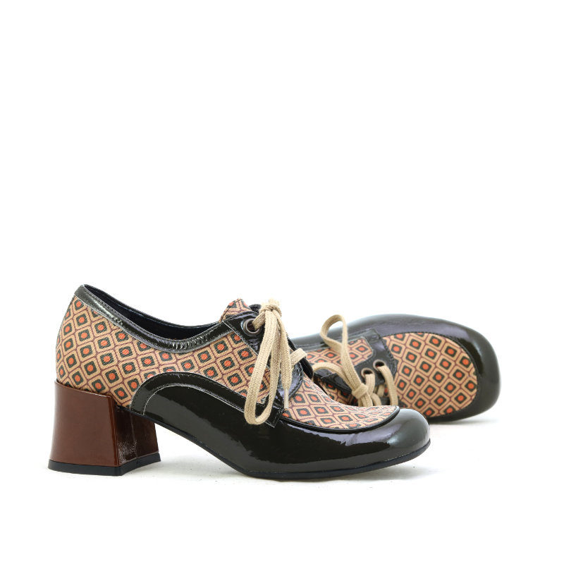 Stylowe półbuty na słupku w klimacie retro wyróżniają się unikalnym, geometrycznym wzorem w ciepłych odcieniach brązu i pomarańczu. Lakierowane, czarne wykończenia nadają całości elegancji i kontrastu, a klasyczne sznurowanie podkreśla ponadczasowy charakter modelu. Stabilny obcas zapewnia wygodę i pewność kroku, dzięki czemu buty świetnie sprawdzą się zarówno w codziennych stylizacjach, jak i bardziej wyrazistych, modowych zestawach.