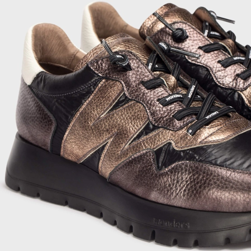 Sneakersy Wonders A-2491 to połączenie wygody, miejskiego stylu i oryginalnego designu. Cholewka wykonana z połączenia gładkiej oraz marszczonej skóry naturalnej w odcieniach czerni i metalicznego brązu nadaje im nowoczesny charakter. Miękka wkładka i solidna podeszwa z lekkiego tworzywa zapewniają komfort przez cały dzień. To model idealny na co dzień – świetnie pasuje zarówno do jeansów, jak i spódnic czy sukienek w sportowym stylu.